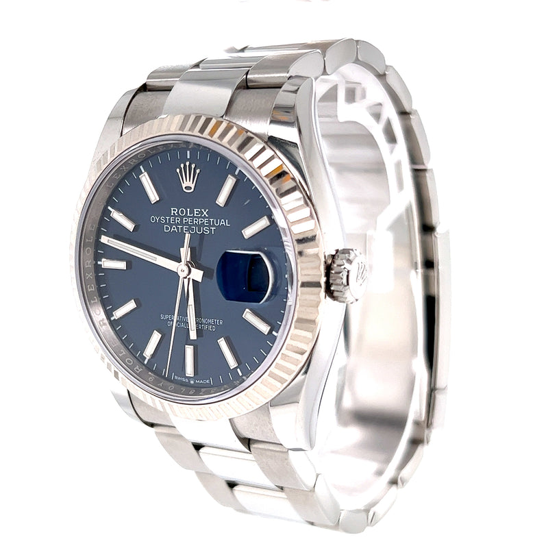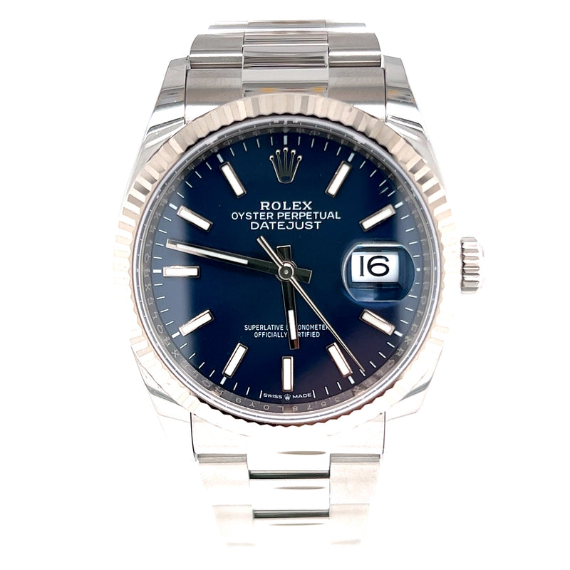 Unworn 2020 36mm Stainless Steel 126234 Rolex Datejust Blue Dial with a White Gold fluted Bezel.