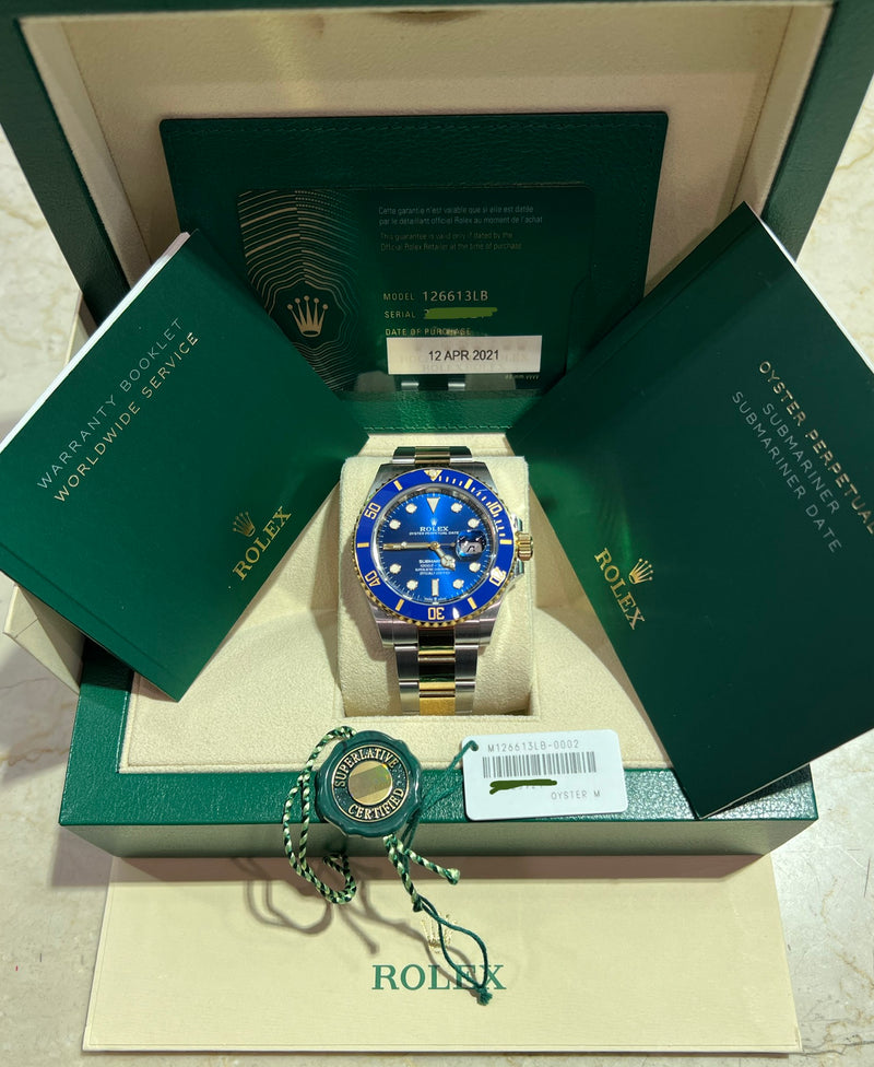 Pre-owned 2021 41mm Two Tone Yellow Gold 126613LB Rolex Submariner "Bluesy".