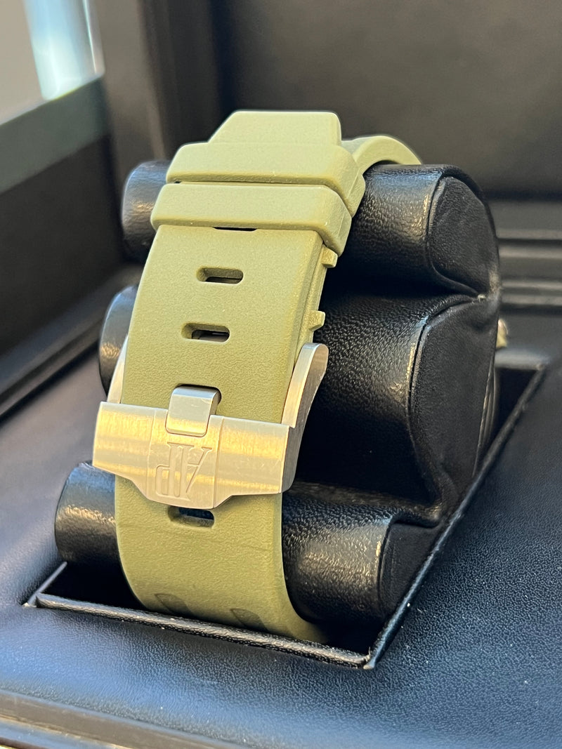 Pre-owned 2017 42mm Stainless Steel 15710ST Audemars Piguet Royal Oak Offshore Green Dial on a Green Rubber Strap.