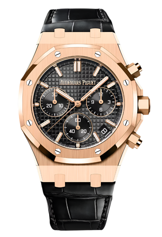 Unworn 2023 41mm Rose Gold 26240OR Audemars Piguet Royal Oak Chronograph Black Dial on a Black Leather Strap.