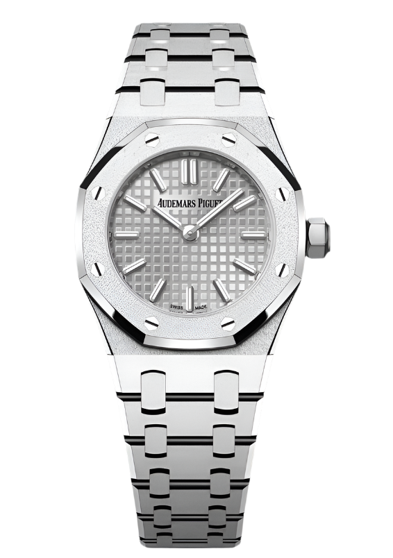 Unworn 2024 23mm White Gold 67630BC Audemars Piguet Royal Oak Mini Grey Dial on a Full White Gold Audemars Piguet Bracelet.