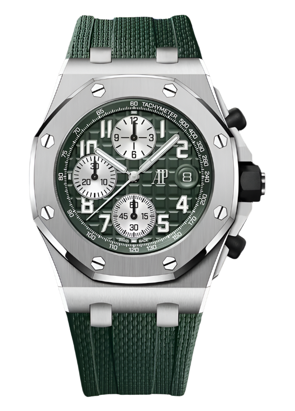 Unworn 2023 42mm Titanium 26238TI Audemars Piguet Royal Oak Offshore Chronograph Green Dial on a Green Rubber Strap.