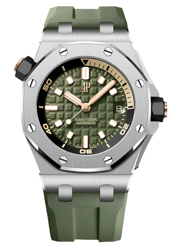 Unworn 2023 42mm Stainless Steel 15720ST Audemars Piguet Royal Oak Offshore Diver Green Dial on a Green Rubber Strap.