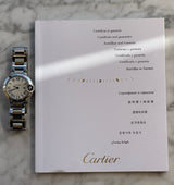 This watch depicts some signs of wear. This watch includes the original Cartier box and warranty paperwork. The watch also includes a 1 year David and Sons Timepiece warranty.