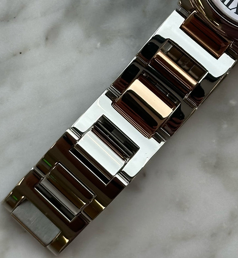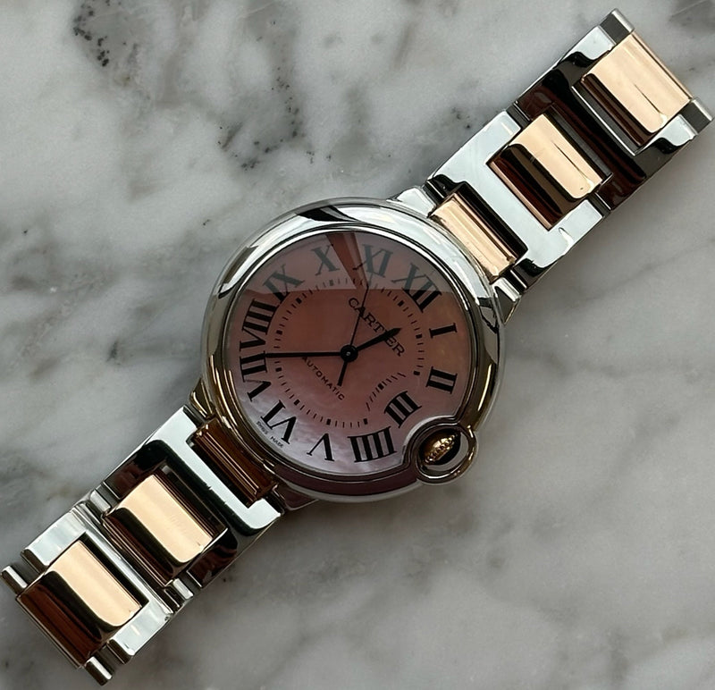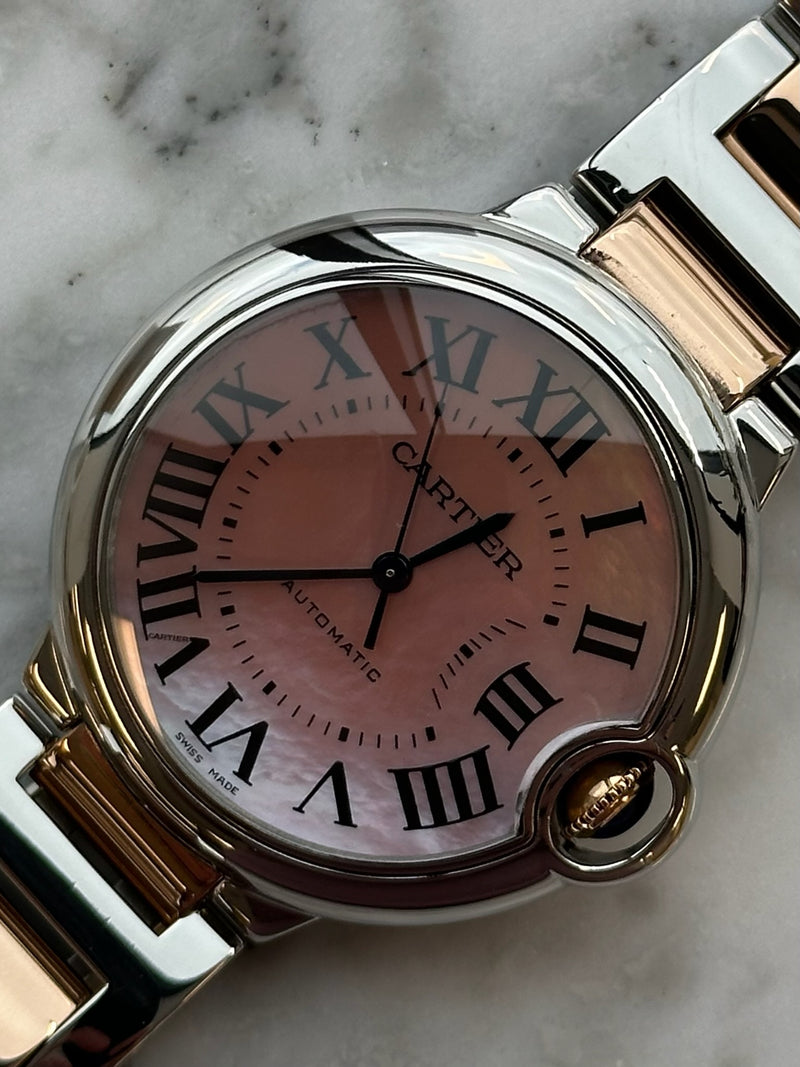 Pre-owned 36mm Two Tone Rose Gold W6920033 Cartier Ballon Bleu Mother of Pearl Dial with a Stainless Steel Bezel on a Two Tone Rose Gold Bracelet.