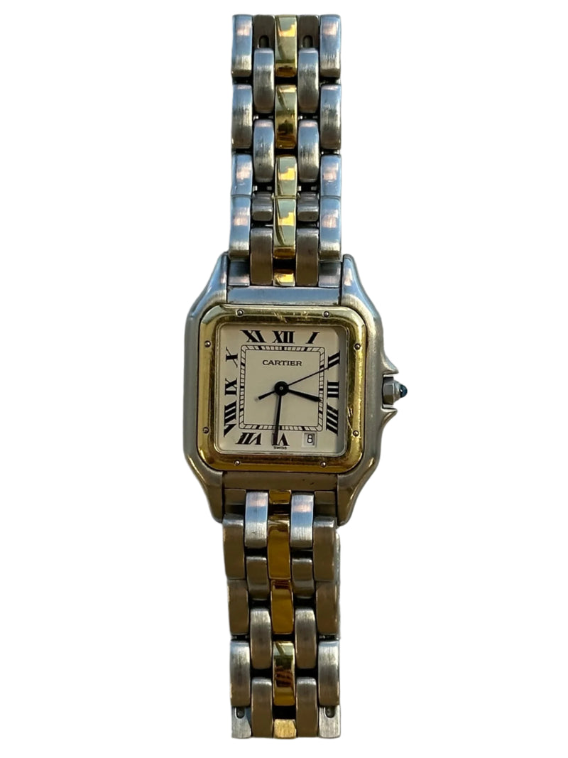 Pre-owned 27 x 37mm Stainless Steel 83083241 Cartier Panthère White Dial with a Yellow Gold Bezel on a Full Two Tone Yellow Gold Cartier Bracelet.