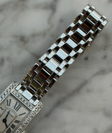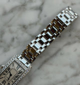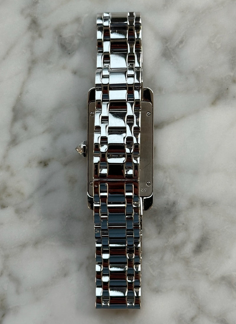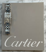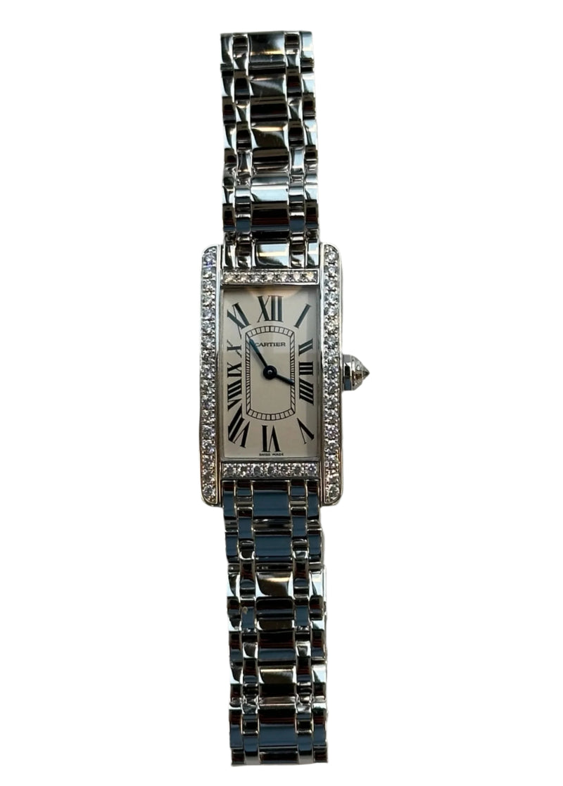 Pre-owned 19 x 35mm White Gold 2489 Cartier Tank Américaine White Dial with a Diamond Bezel on a Stainless Steel Bracelet.