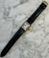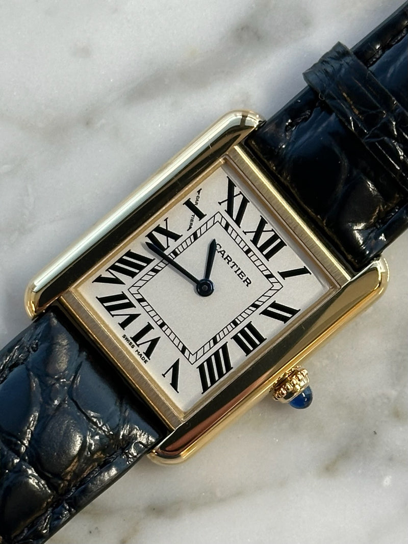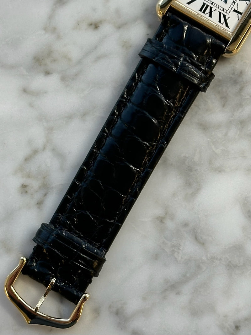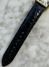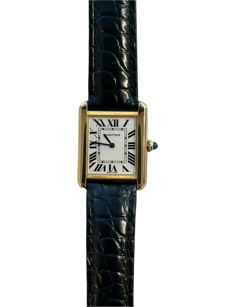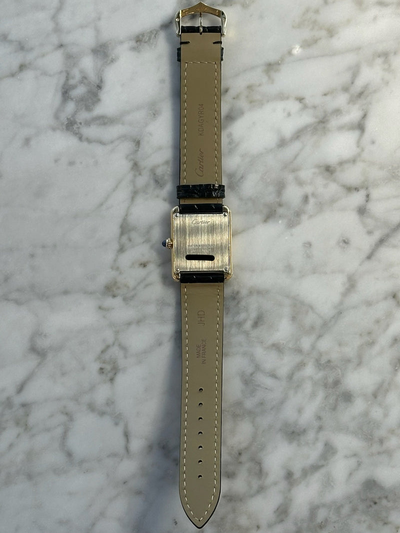 Pre-owned 31 x 24.4mm Yellow Gold w5200002/3168 Cartier Tank Solo White Dial with a Yellow Gold Steel Bezel on a Black Leather Strap.