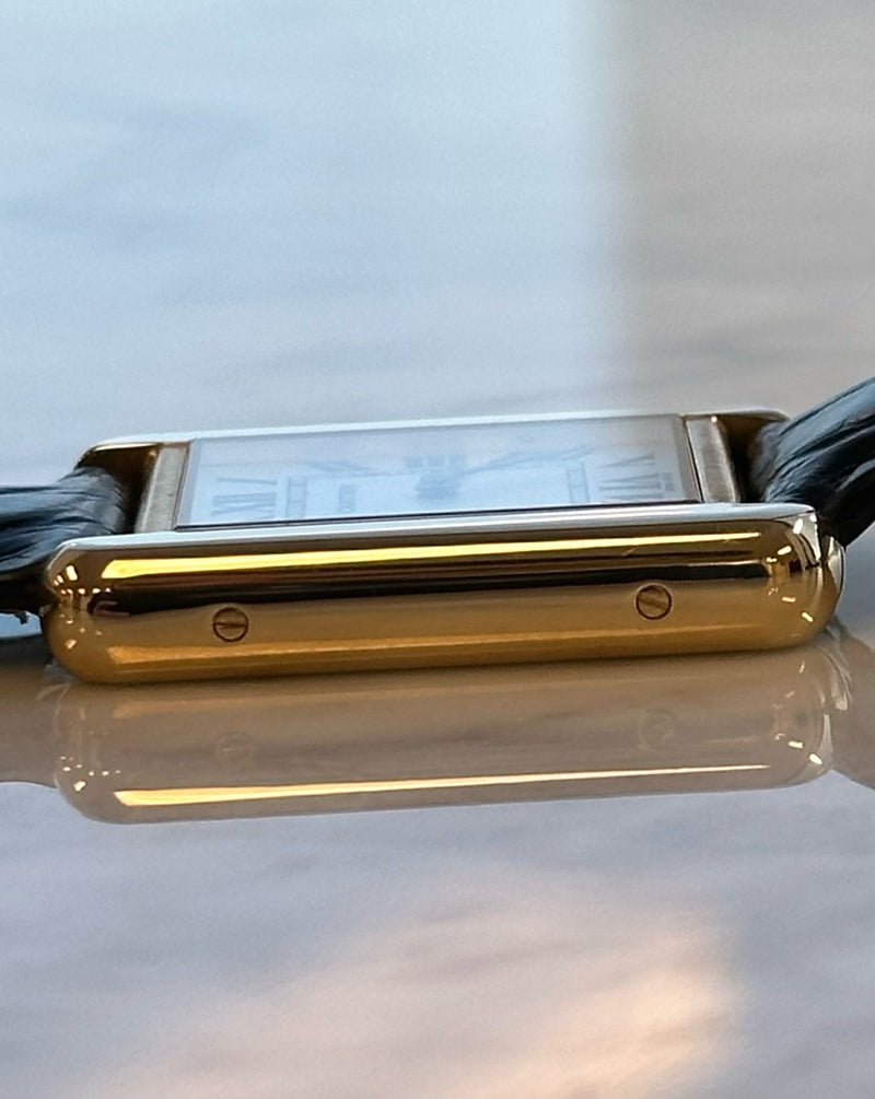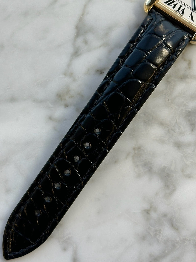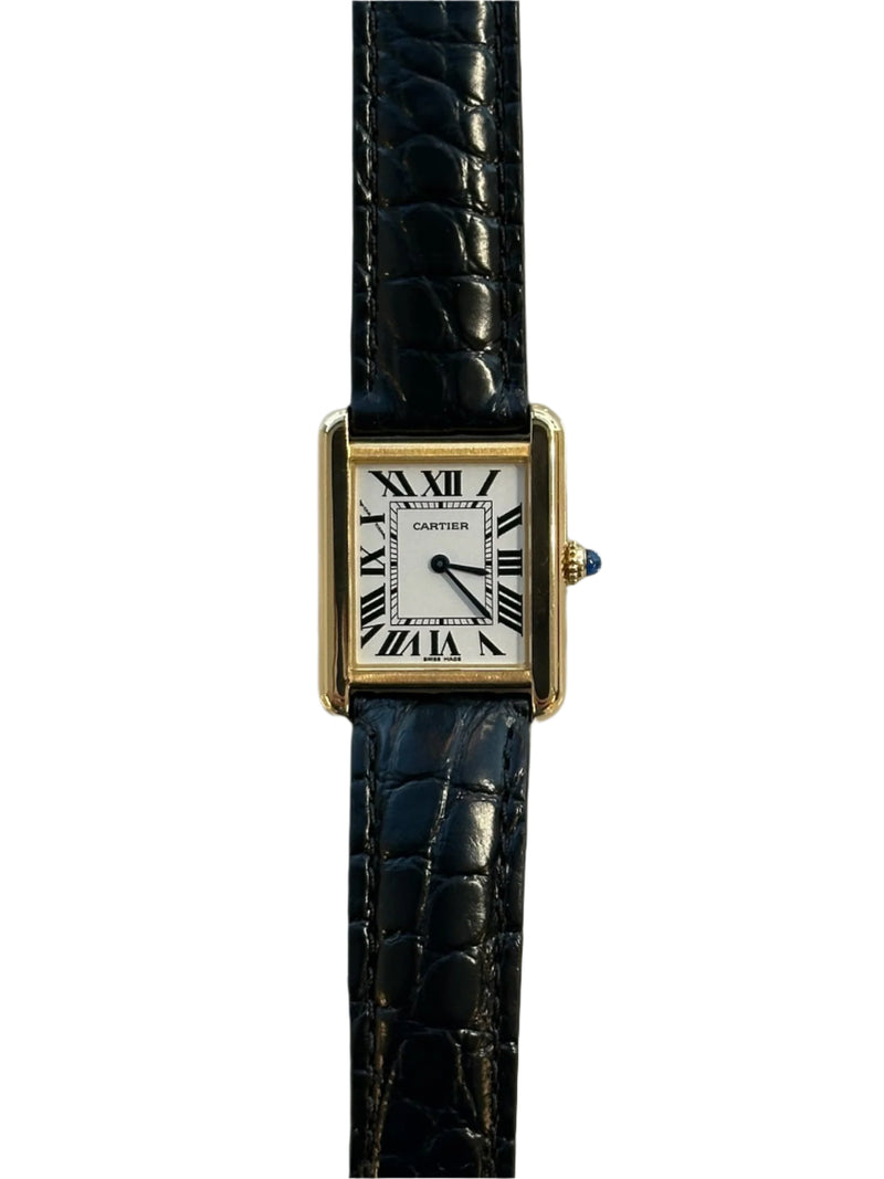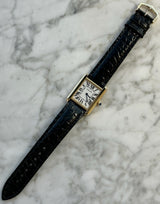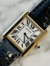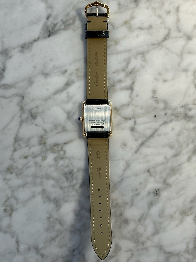 Pre-owned 31 x 24.4mm Yellow Gold w5200002/3168 Cartier Tank Solo White Dial with a Yellow Gold Steel Bezel on a Black Leather Strap.