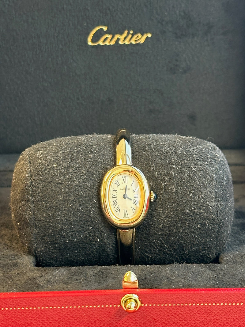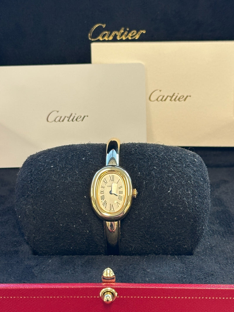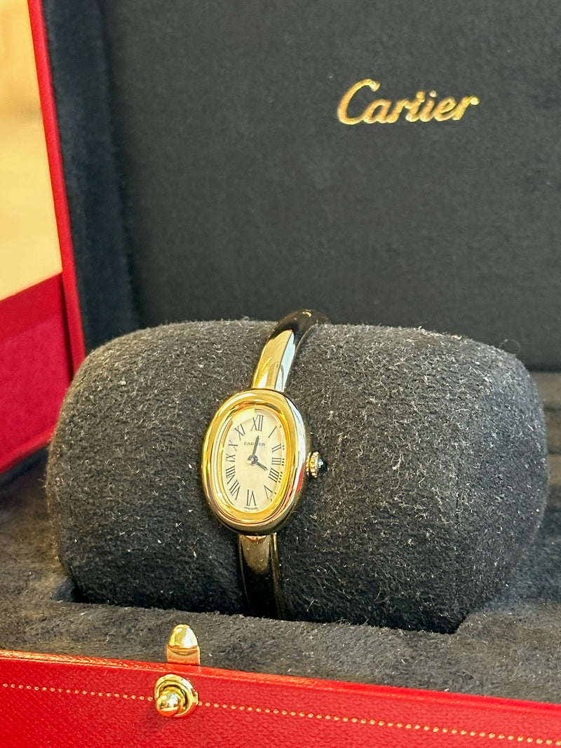 Unworn 2024 24.6 x 18.7mm Yellow Gold WGBA0044 Baignoire Mini Size 15 White Dial with a Yellow Gold Bezel on a Full Yellow Gold Cartier Bracelet.