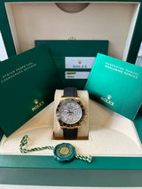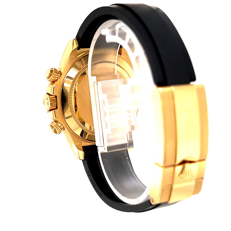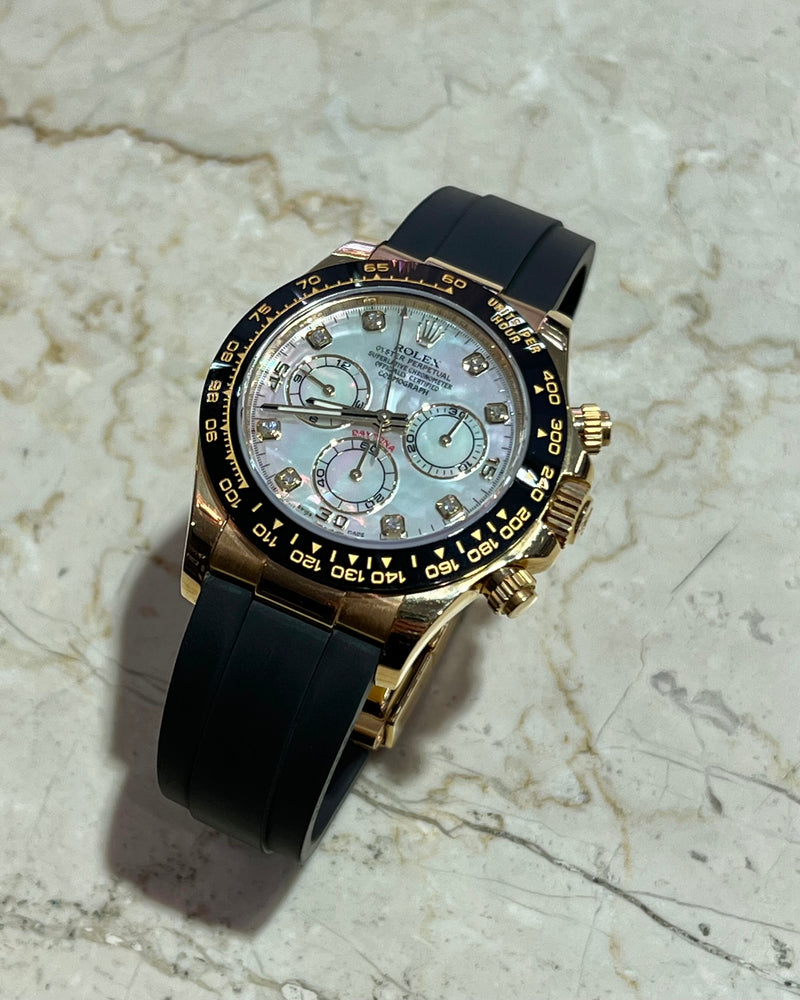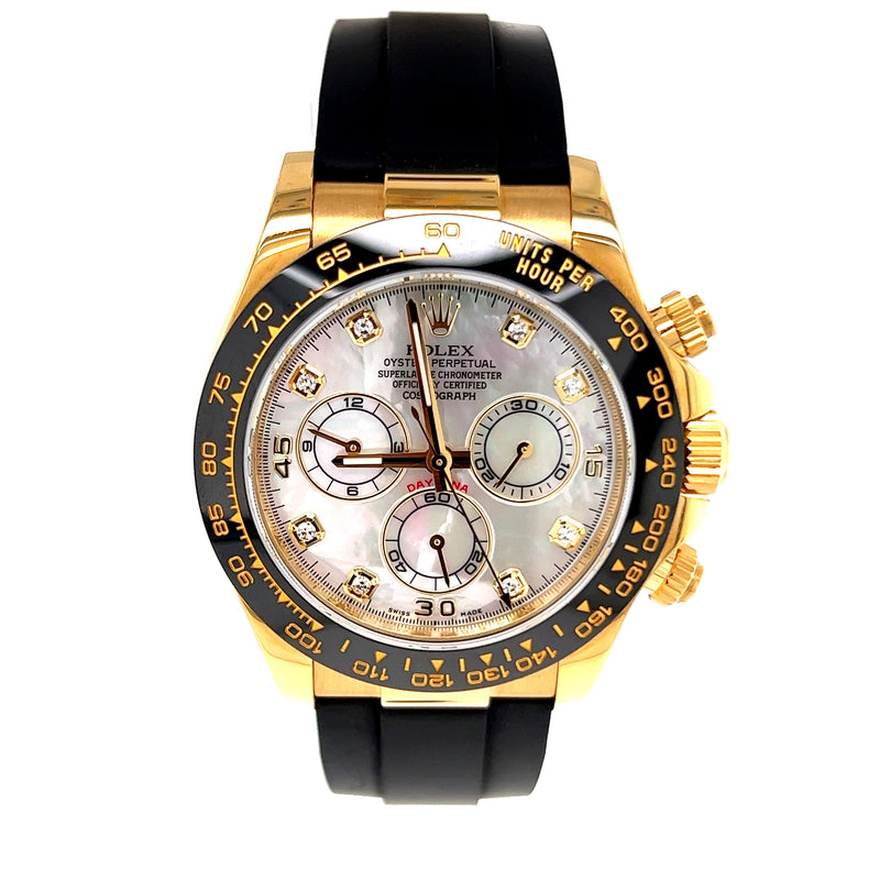 Pre-owned 2017 40mm Yellow Gold 116518LN Rolex Daytona Mother of Pearl Diamond Dial with a Black Bezel on an Oysterflex Bracelet.