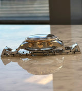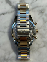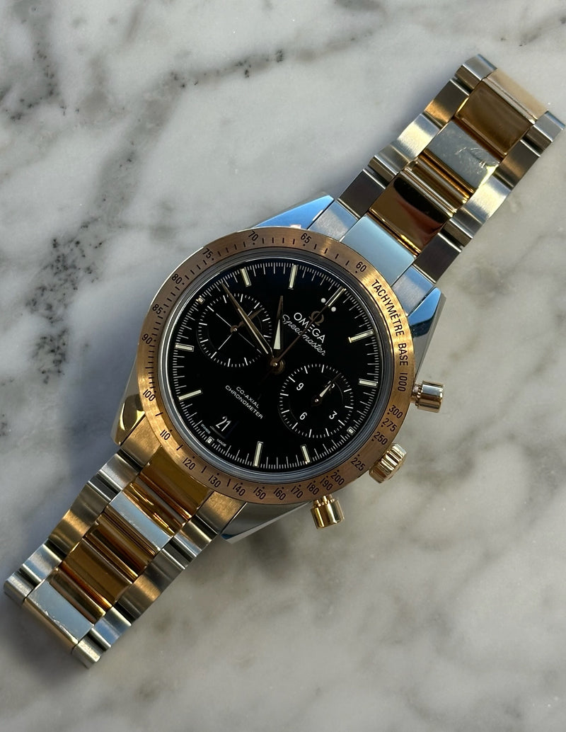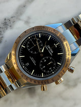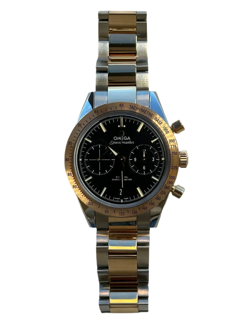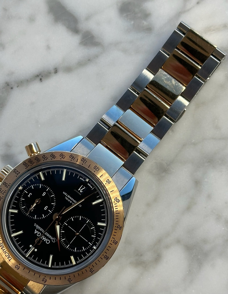 Pre-owned 2023 41mm Stainless Steel 331.20.42.51.01.002 Omega Speedmaster Black Dial with a Rose Gold Bezel on a Stainless Steel Bracelet.