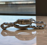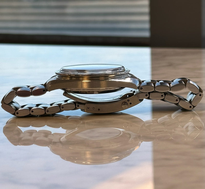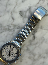 This watch depicts some signs of wear, and includes the original Omega warranty card and box. The watch also includes a 1 year David and Sons Timepiece warranty.