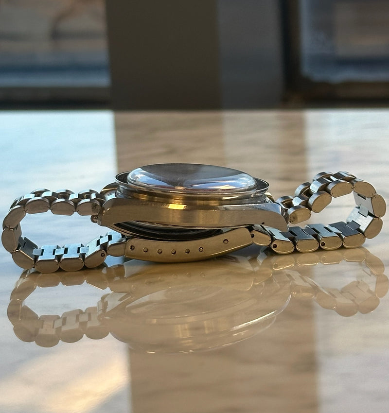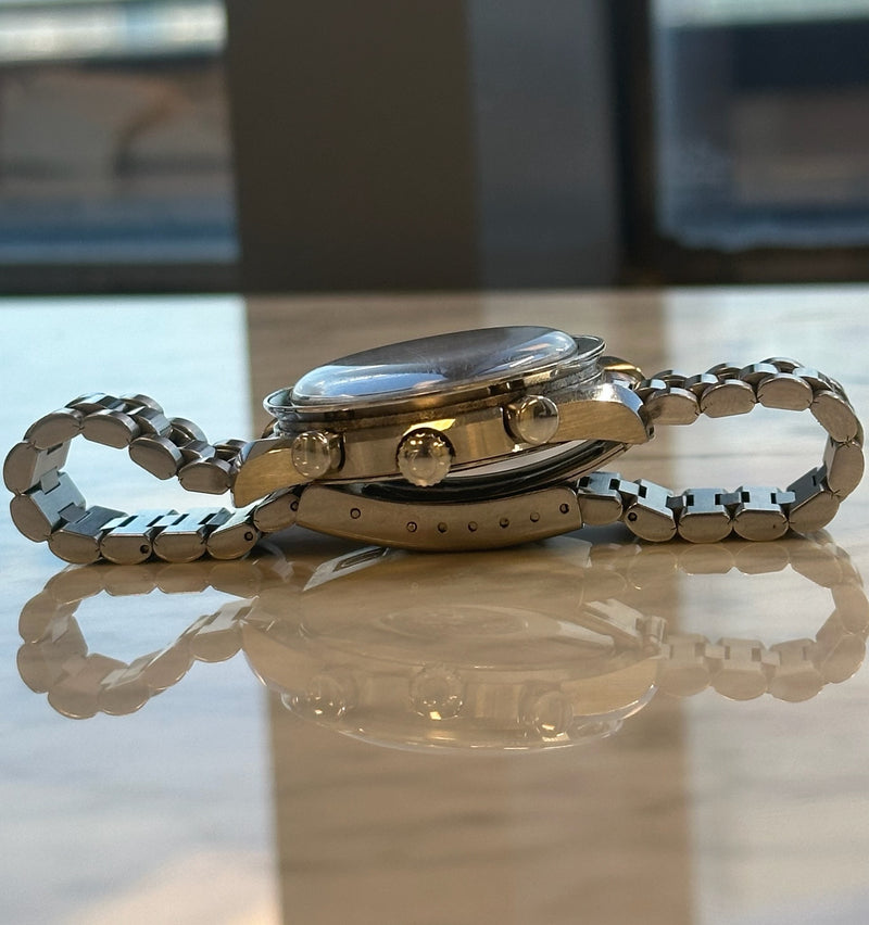 This watch depicts some signs of wear, and includes the original Omega warranty card and box. The watch also includes a 1 year David and Sons Timepiece warranty.