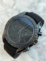 Unworn 2022 44mm Ceramic 311.92.44.51.01.005 Omega Speedmaster Dark Side of the Moon Black Dial with a Black Bezel on a Black Nylon Strap.