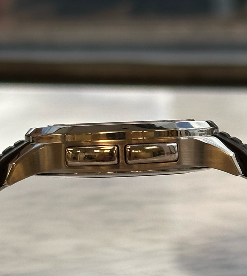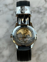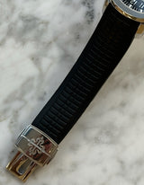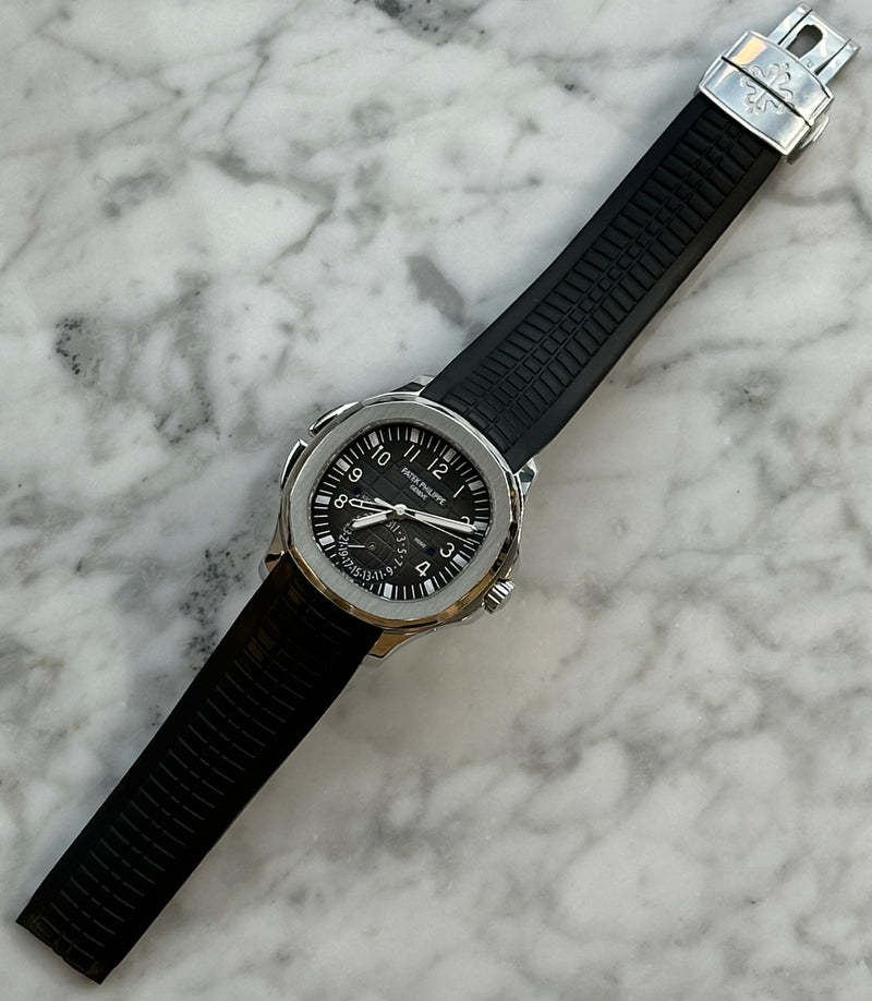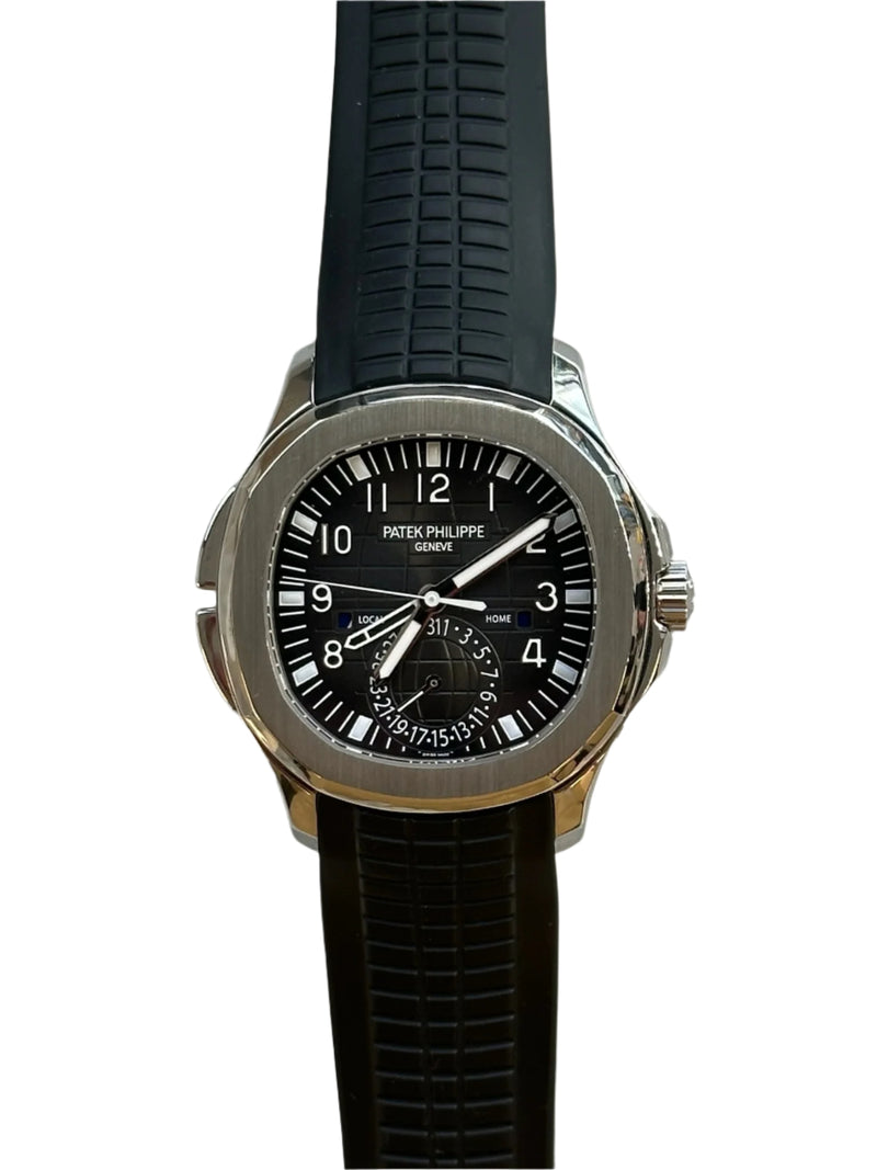 Pre-owned 40mm Stainless Steel 5164A-001 Patek Philippe Aquanaut Travel Time Stainless Steel Bezel on a Black Rubber Strap.