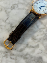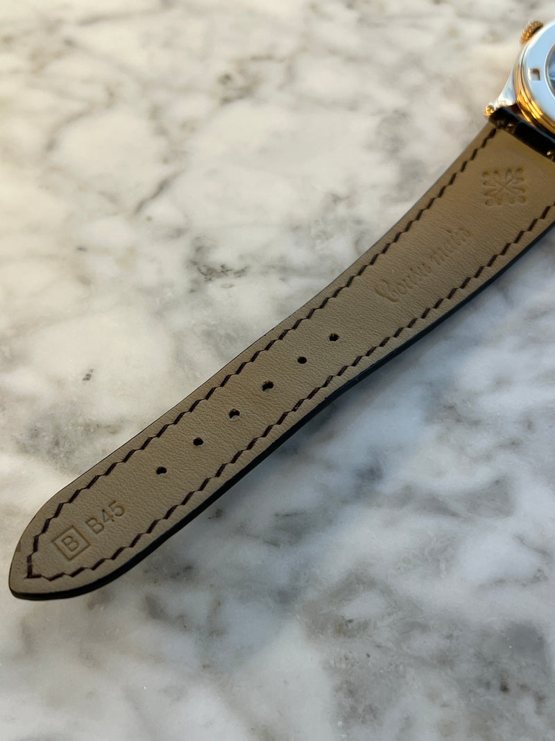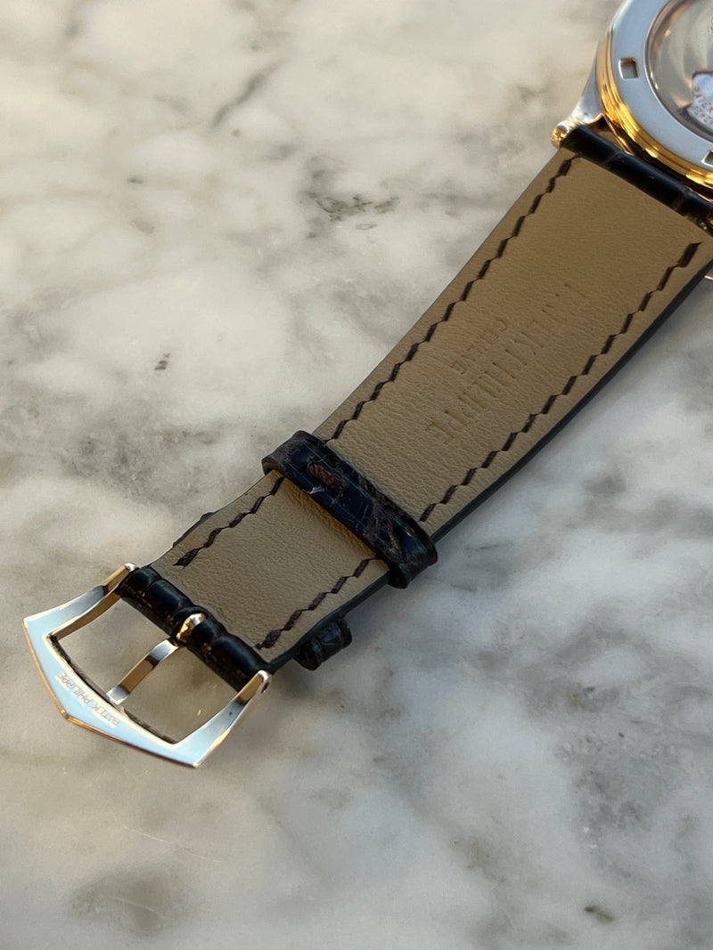 This watch depicts some signs of wear. This watch includes the original Patek Philippe box. The watch also includes a 1 year David and Sons Timepiece warranty.