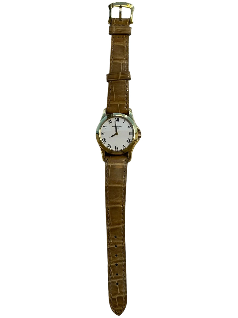 Pre-owned 28mm Yellow Gold 4905j Patek Philippe Calatrava on a Leather Strap.
