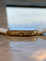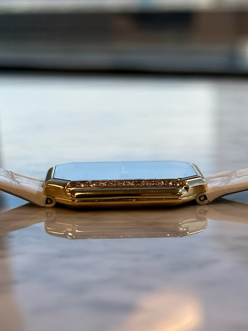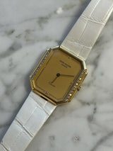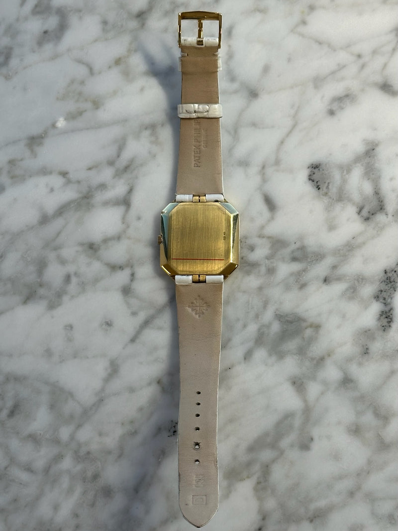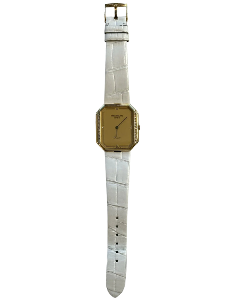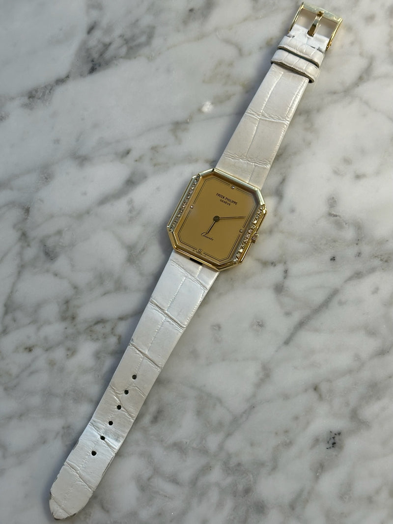 Pre-owned 32 x 30mm Yellow Gold 3894 Patek Philippe Gondolo Champagne Dial Diamond Bezel on a Factory White Leather Patek Philippe Strap.