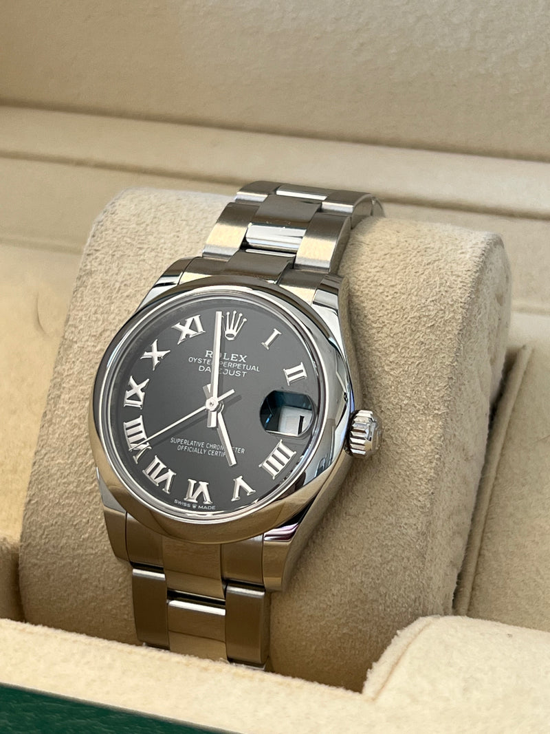 Pre-owned 2024 31mm Stainless Steel 278240 Rolex Datejust 31 Black Roman Dial with a Smooth Stainless Steel Bezel on an Oyster Bracelet.