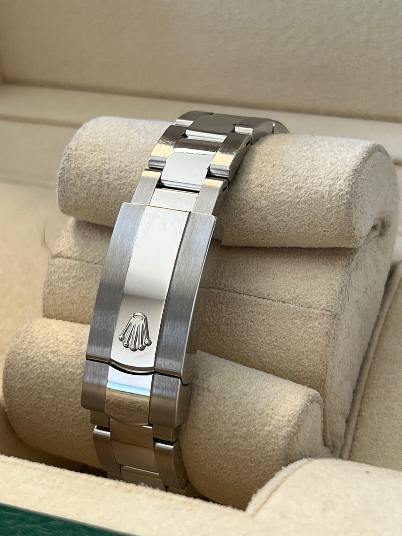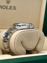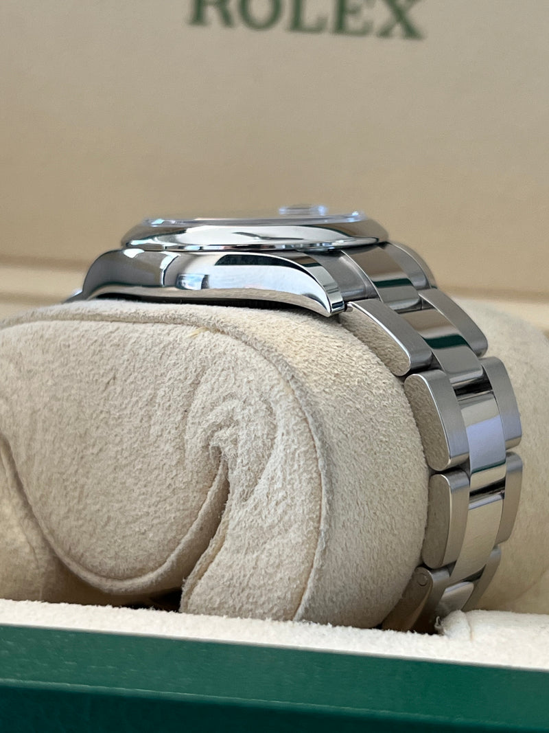 This watch depicts some signs of wear. This watch includes the original Rolex warranty card and the original Rolex box. The watch also includes a 1 year David and Sons Timepiece warranty.