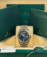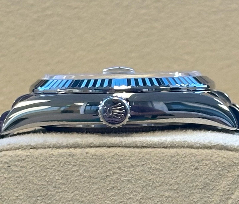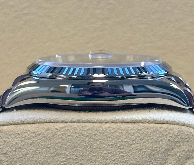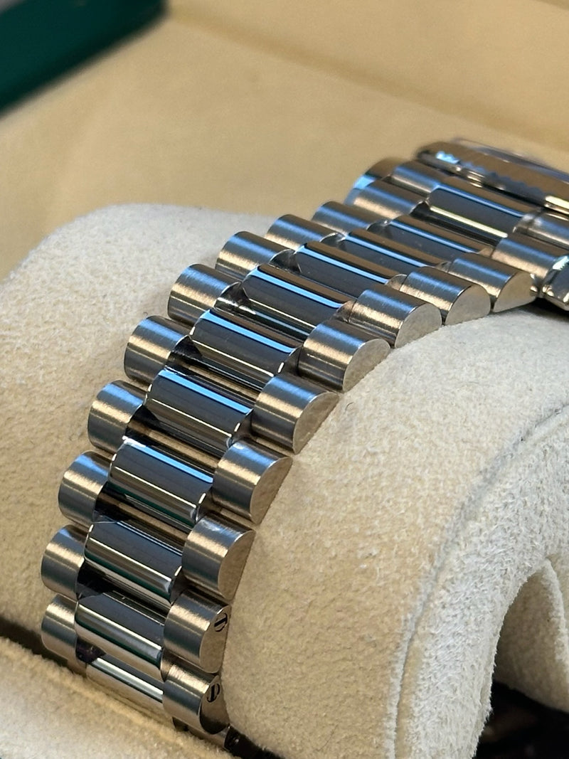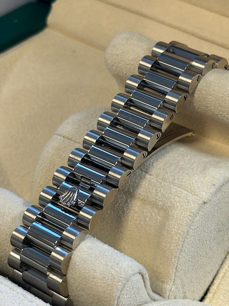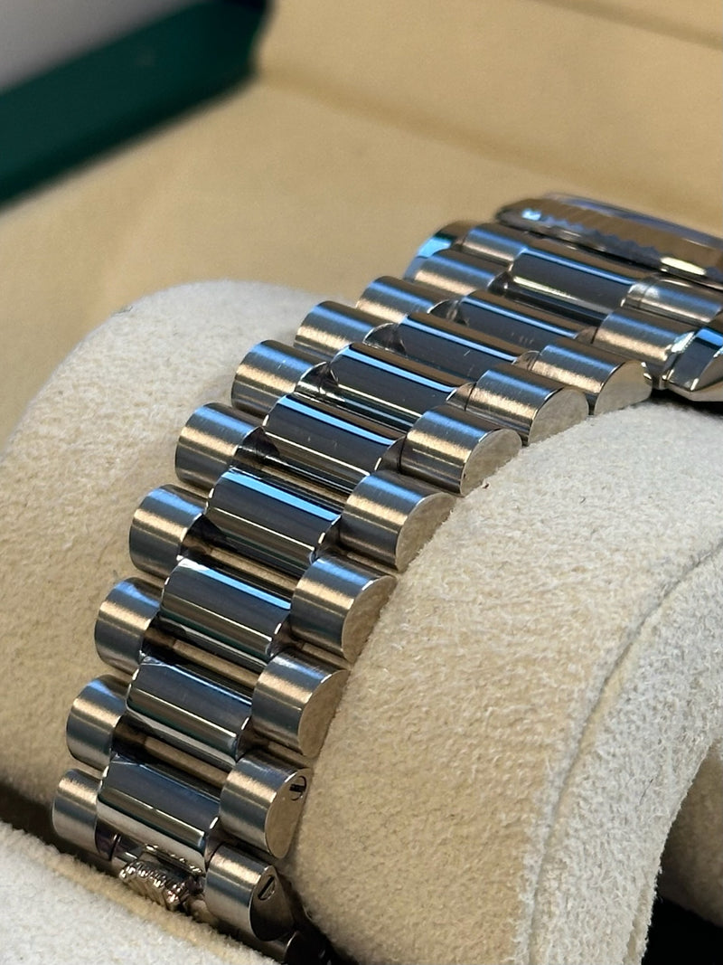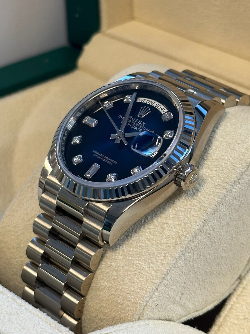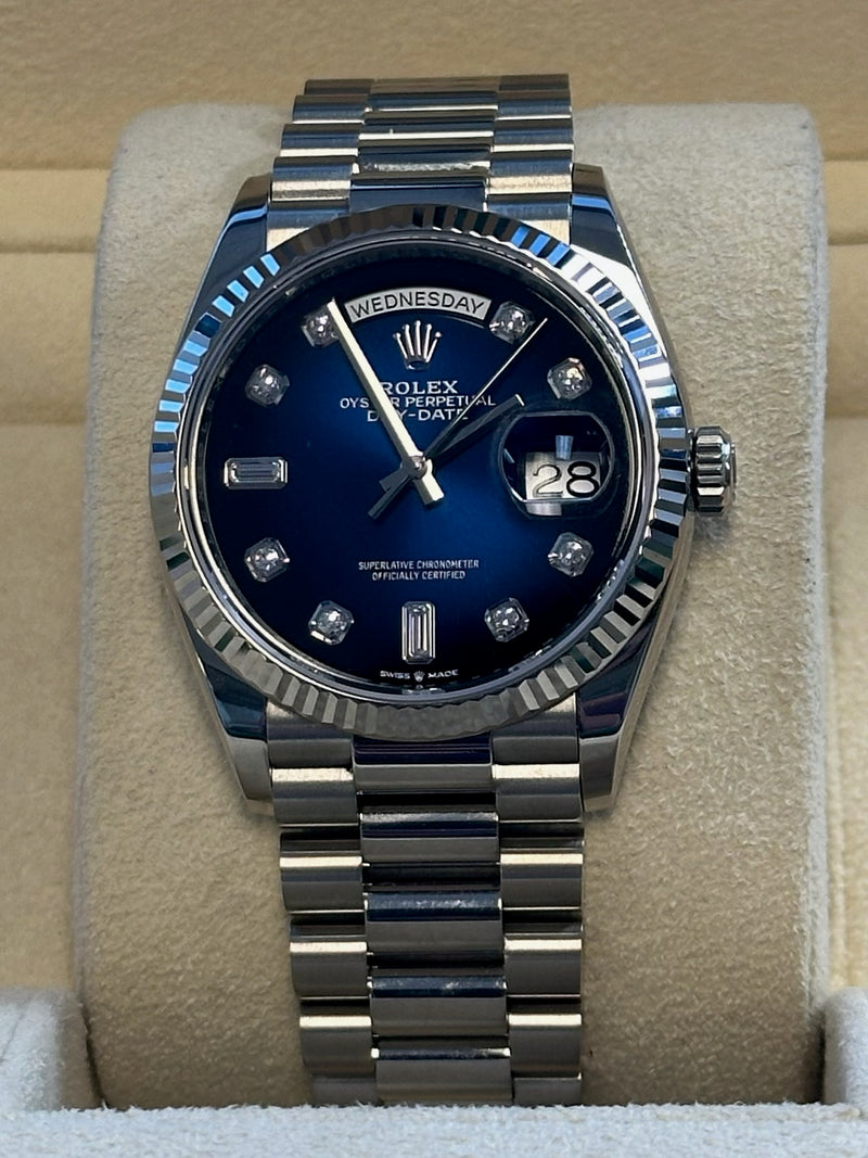 Pre-owned 2022 36mm White Gold 128239 Rolex Day-Date 36 Blue Ombre Diamond Dial with a White Gold Fluted Bezel on a Presidential Bracelet.