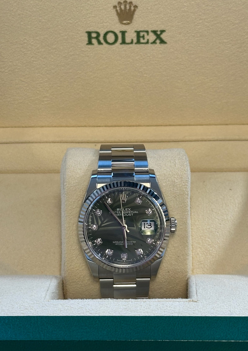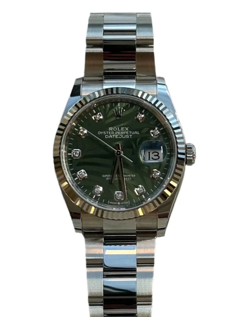 2023 36mm Stainless Steel 126234 Rolex Datejust 36 Green Palm Motif Diamond Dial with a Fluted Bezel and Oyster Bracelet.