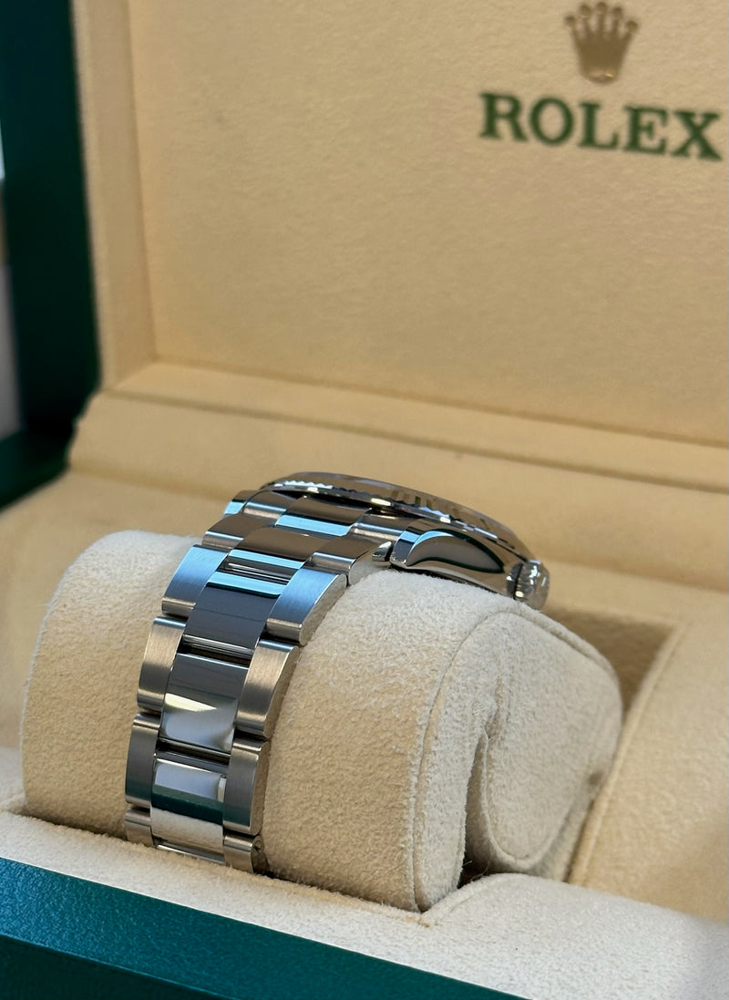 This watch depicts minimal signs of wear. This watch includes the original Rolex warranty card and the original Rolex box. The watch also includes a 1 year David and Sons Timepiece warranty.