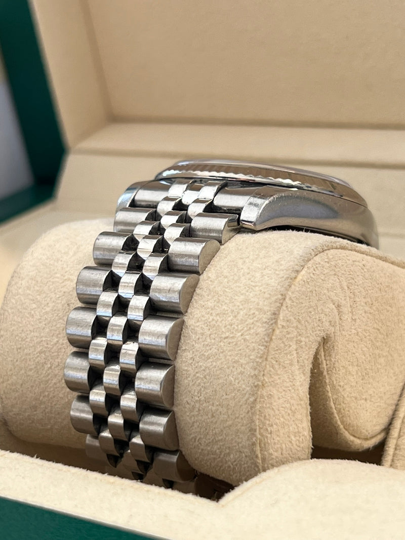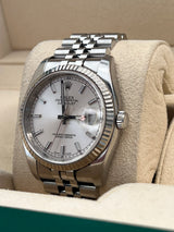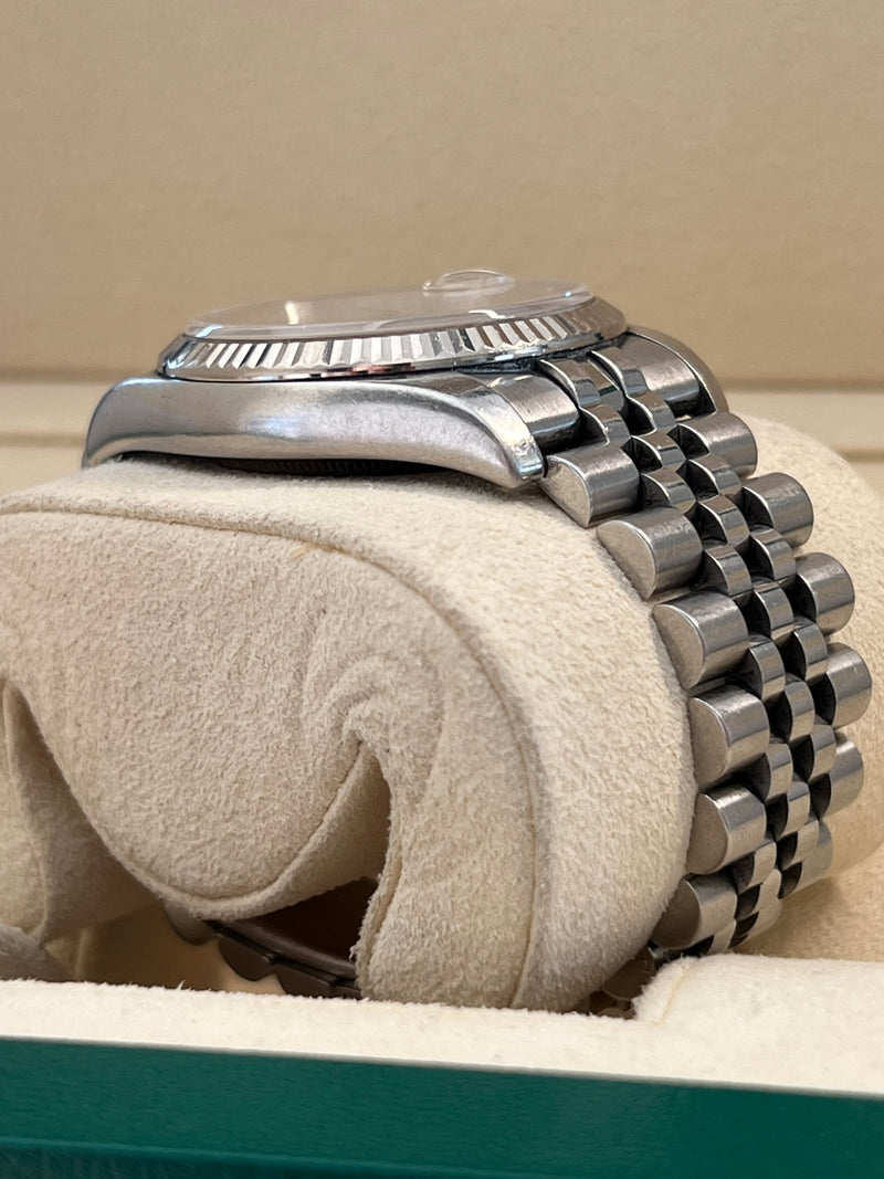 Pre-owned 36mm Stainless Steel 126234 Rolex Datejust 36 Silver Dial with a White Gold Fluted Bezel and Jubilee Bracelet.
