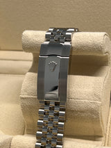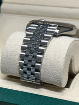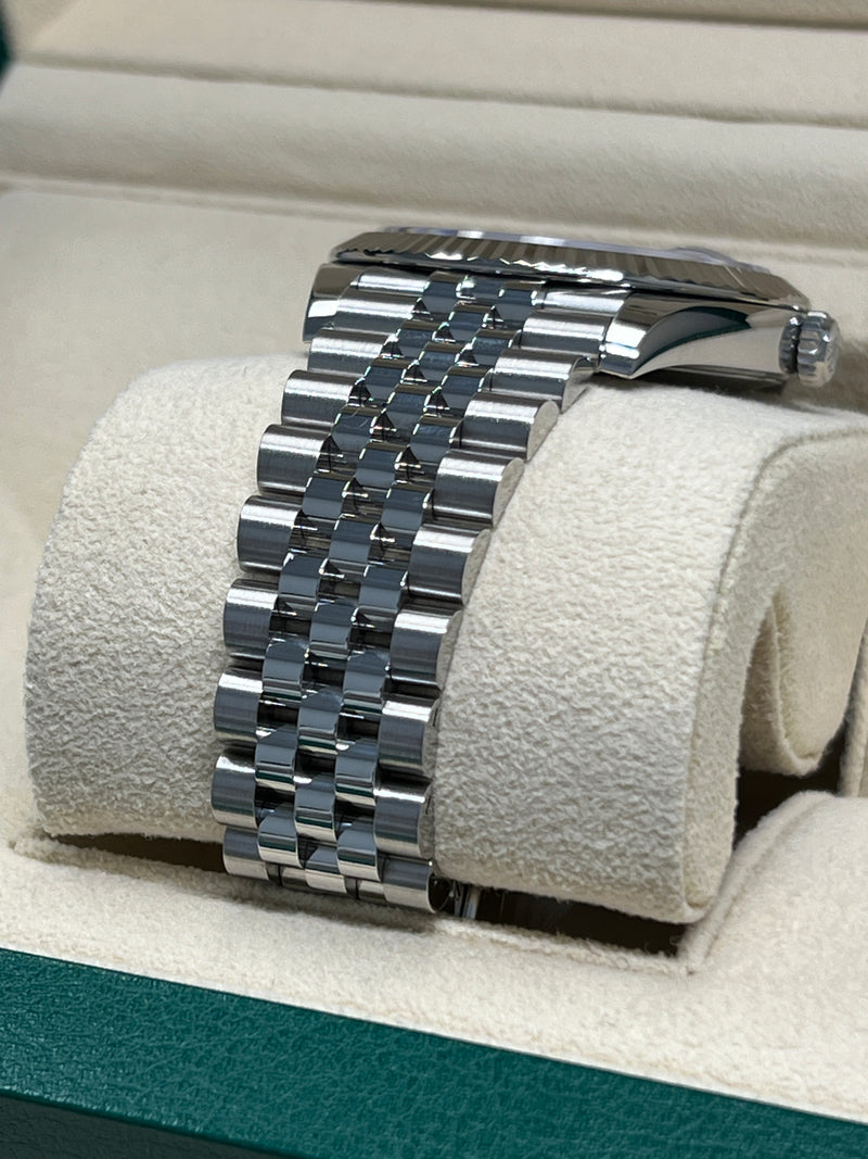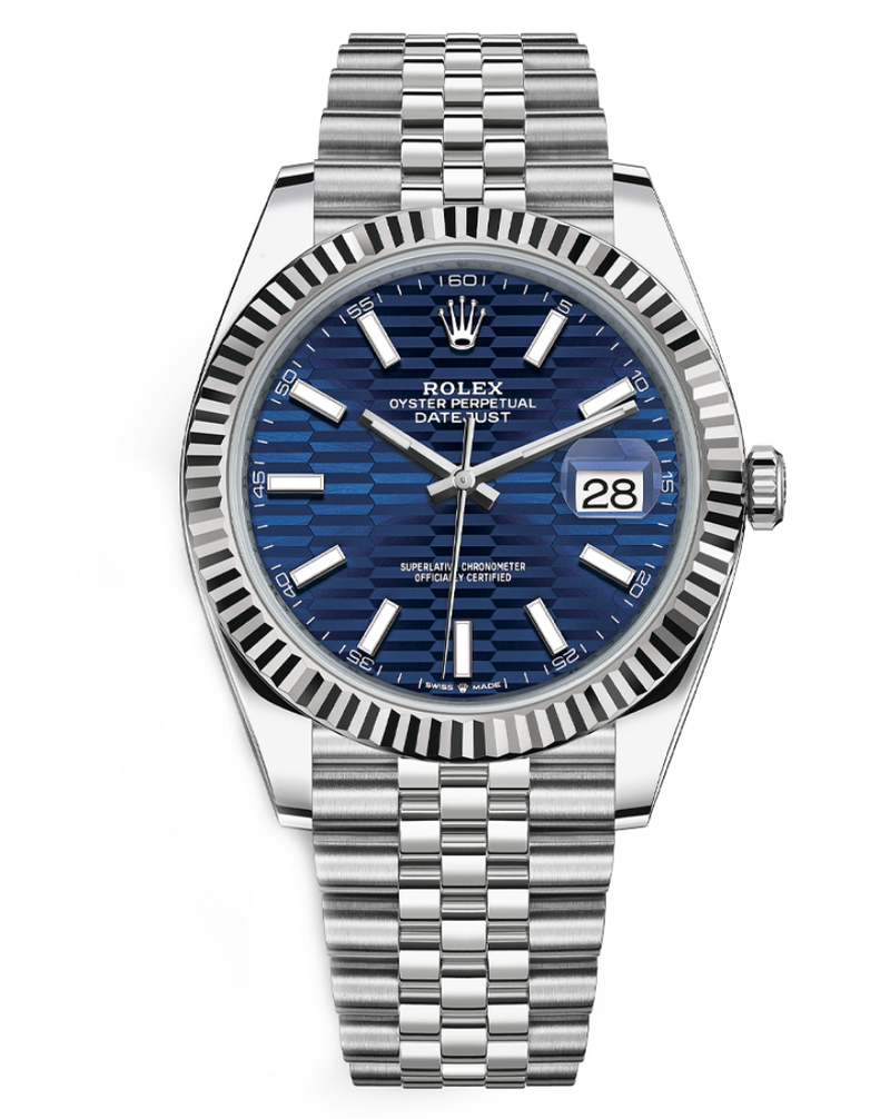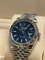 Pre-owned 2024 41mm Stainless Steel 126334 Rolex Datejust 41 Blue Motif Dial with a White Gold Fluted Bezel on a Jubilee Bracelet.