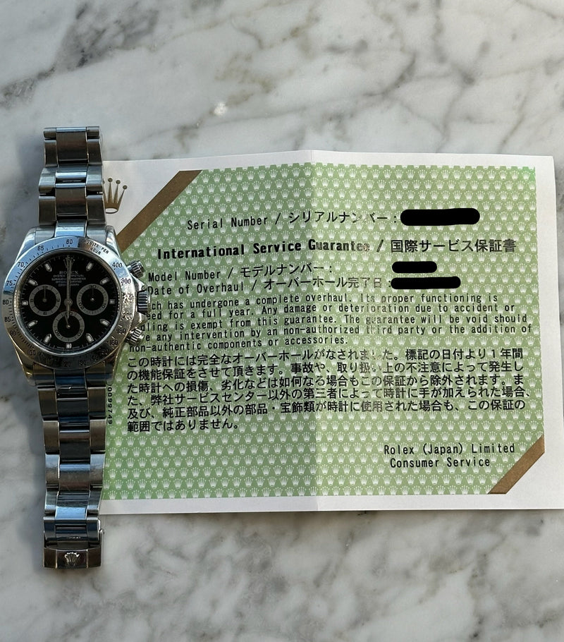 This watch depicts some signs of wear. The watch includes the original Rolex box. The watch also includes a 1 year David and Sons Timepiece warranty.