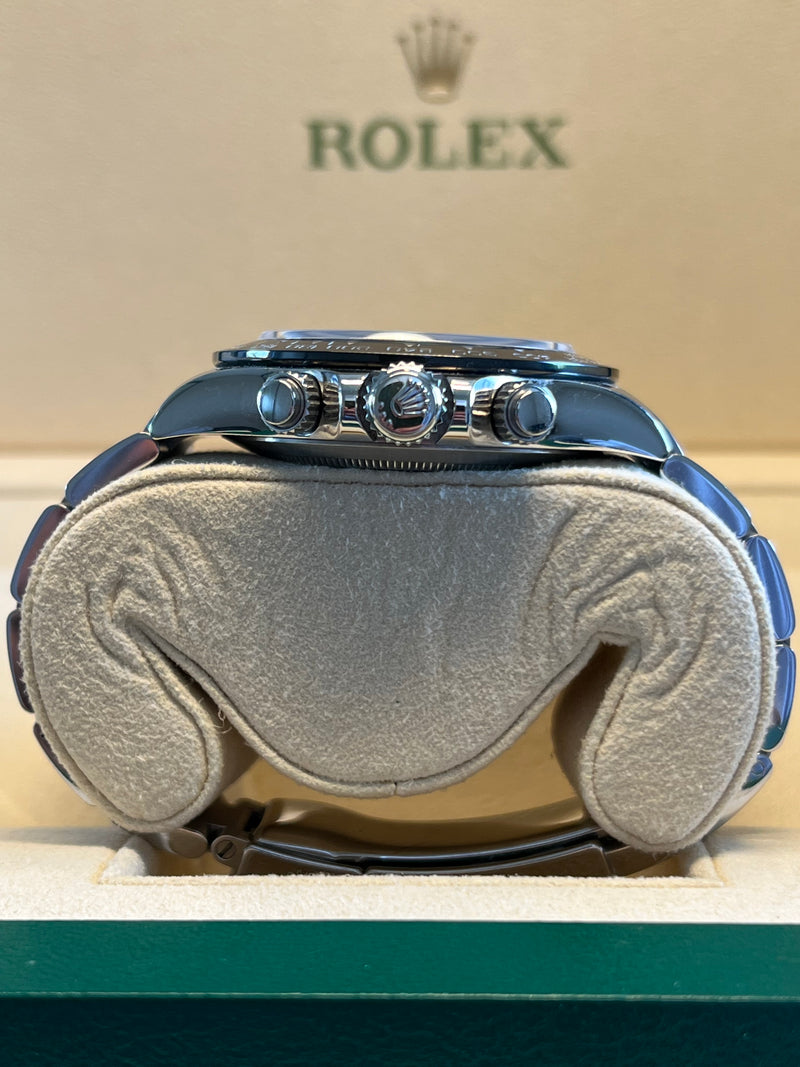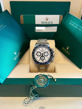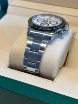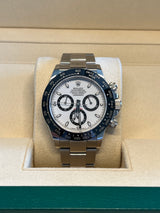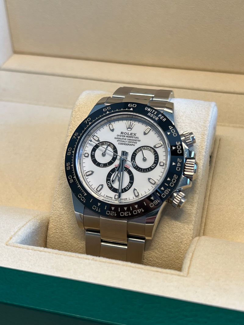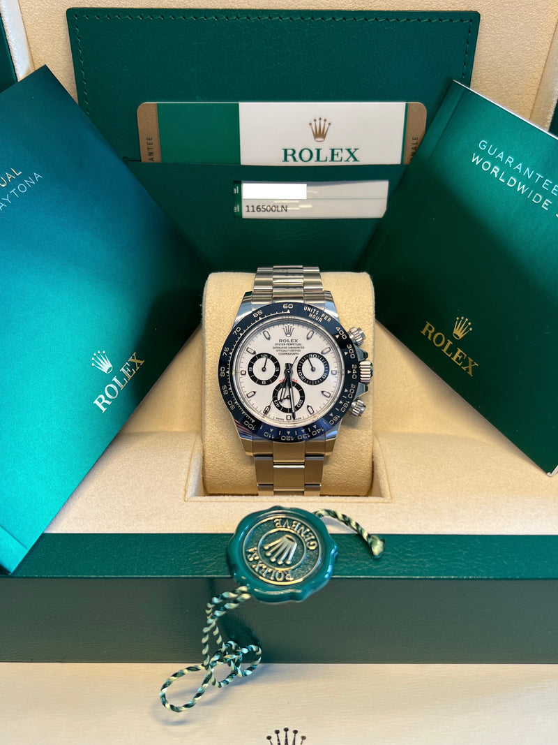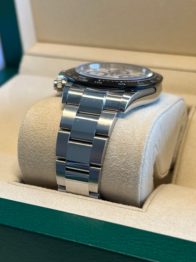 Pre-owned 2018 40mm Stainless Steel 116500LN Rolex Daytona White Dial with a Black Bezel on an Oyster Bracelet.