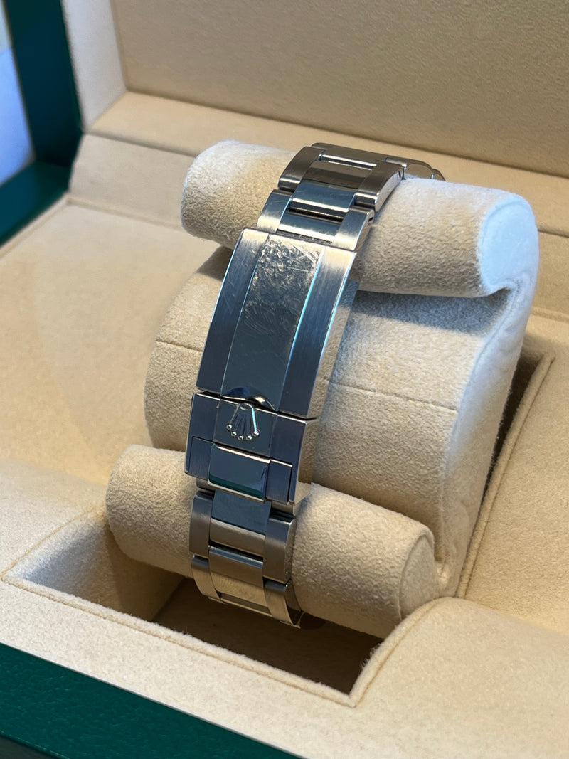 This watch depicts signs of wear. This watch includes the original Rolex warranty card and box. The watch also includes a 1 year David and Sons Timepiece warranty.
