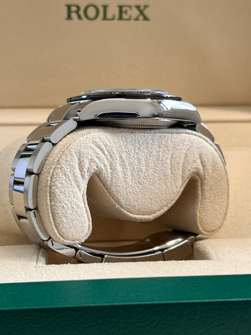 This watch depicts some signs of wear. This watch includes the original Rolex warranty card and box. The watch also includes a 1 year David and Sons Timepiece warranty.