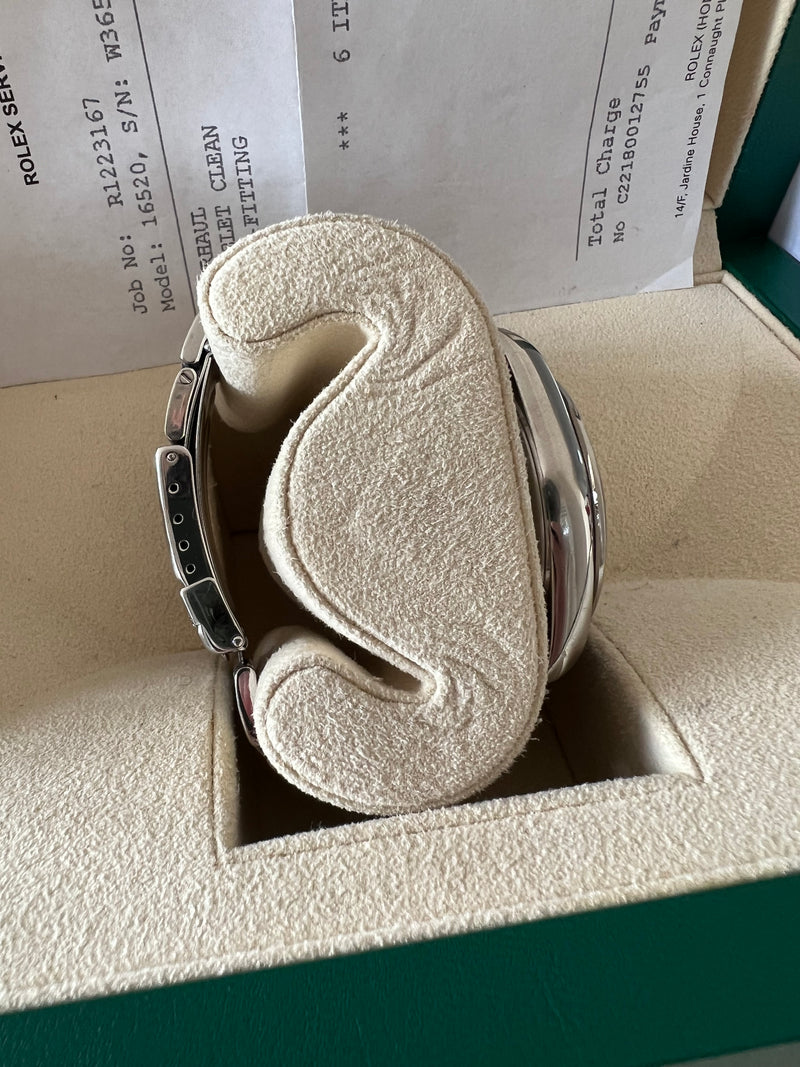 This watch depicts some signs of wear. The watch includes an original Rolex Service Receipt and box. The watch also includes a 1 year David and Sons Timepiece warranty.