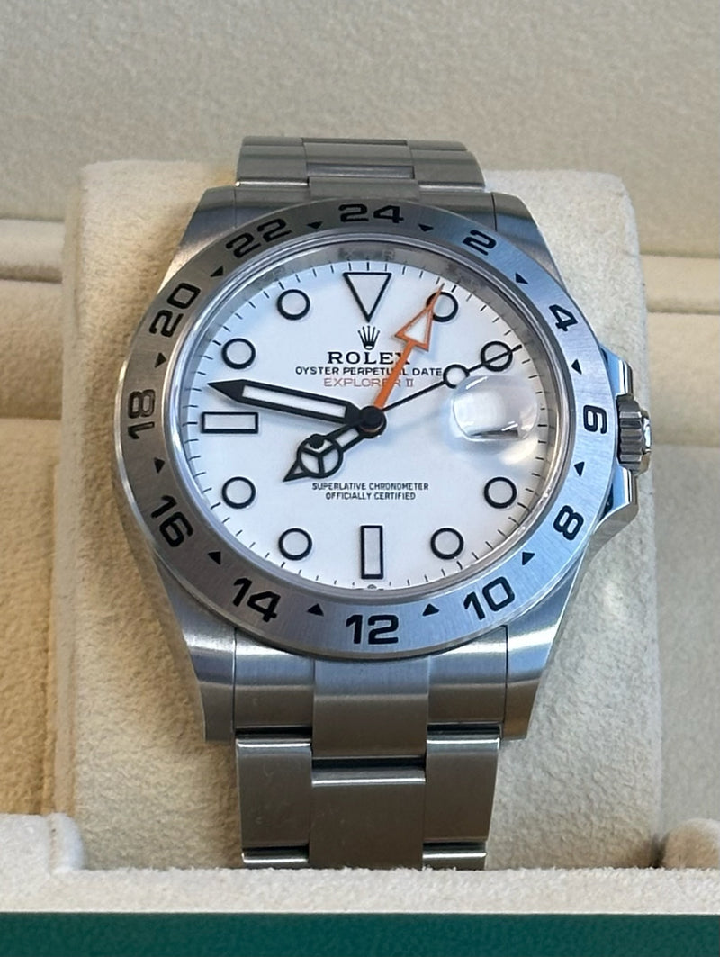 Pre-owned 2022 42mm Stainless Steel 226570 Rolex Explorer II White Dial with a Stainless Steel Bezel on an Oyster Bracelet.