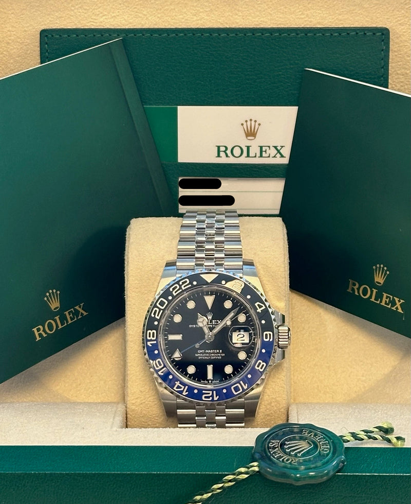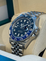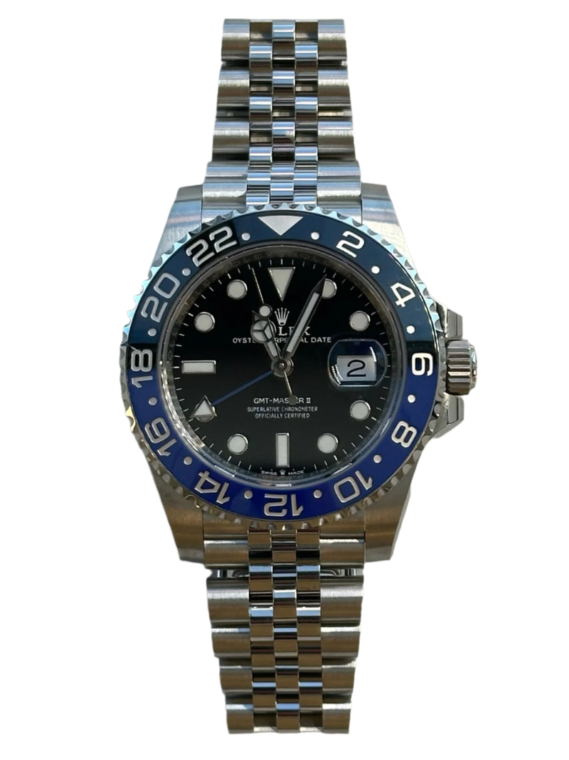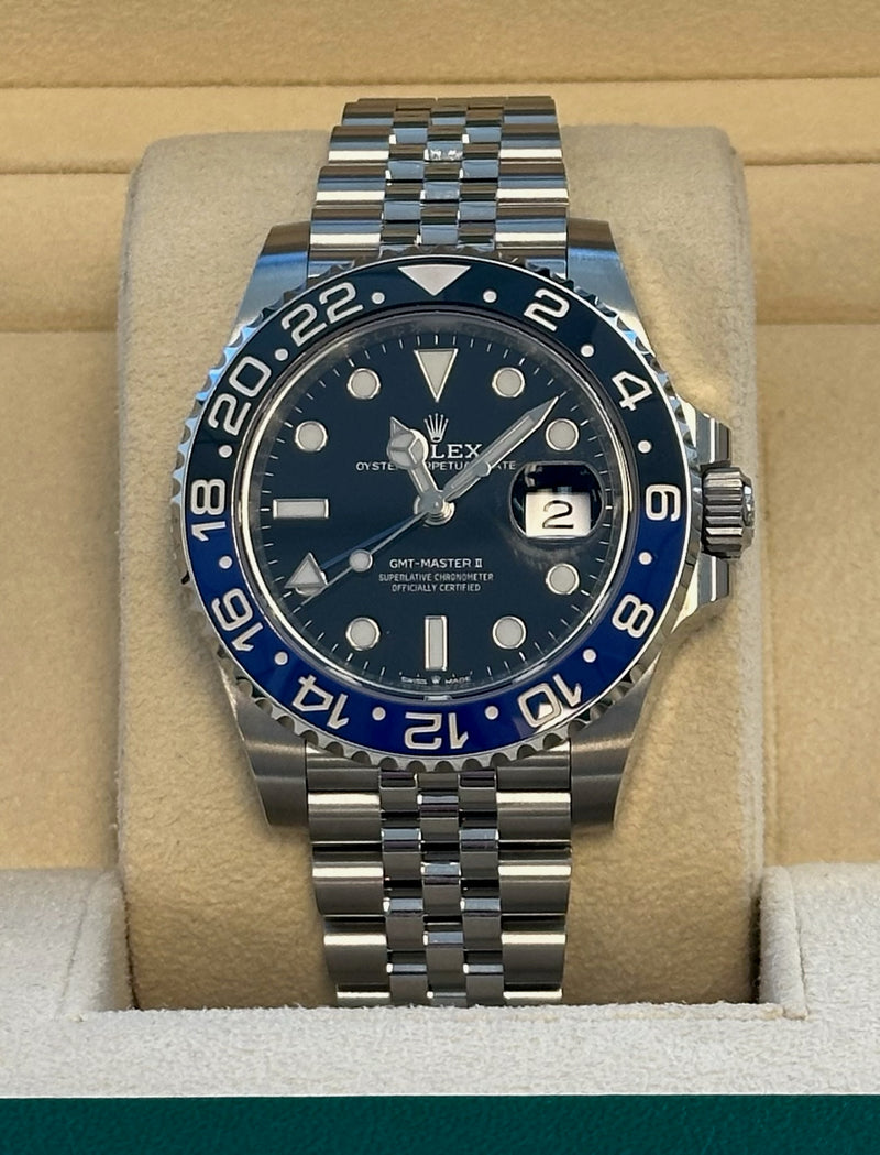 Pre-owned 2019 40mm Stainless Steel 126710BLNR Rolex GMT-Master II "Batgirl" Black Dial with a Black & Blue Bezel on a Jubilee Bracelet.