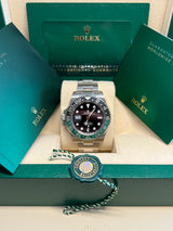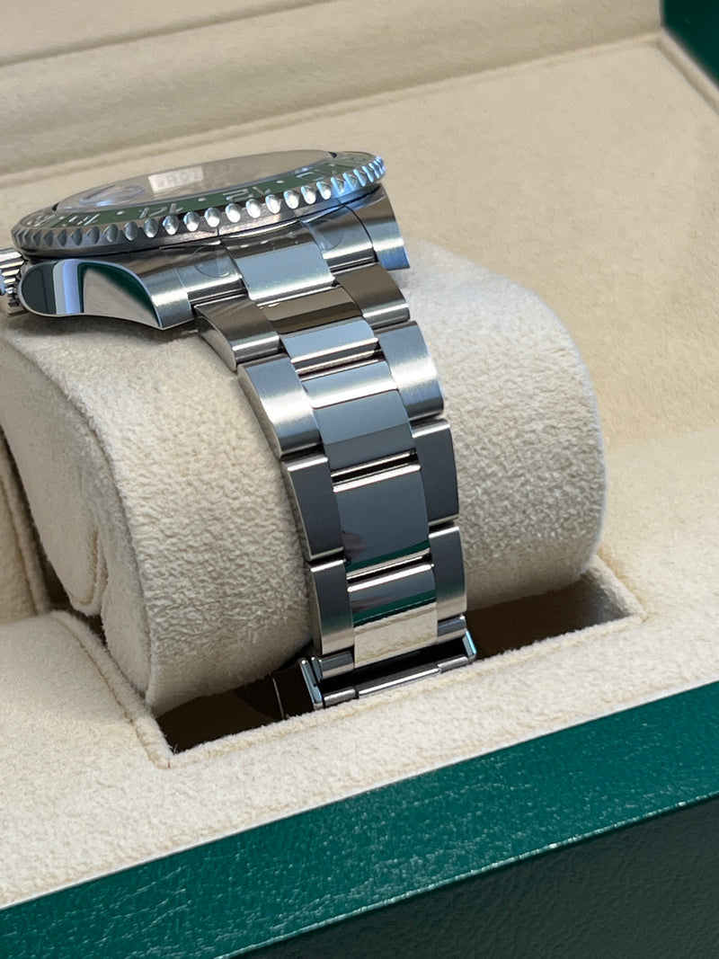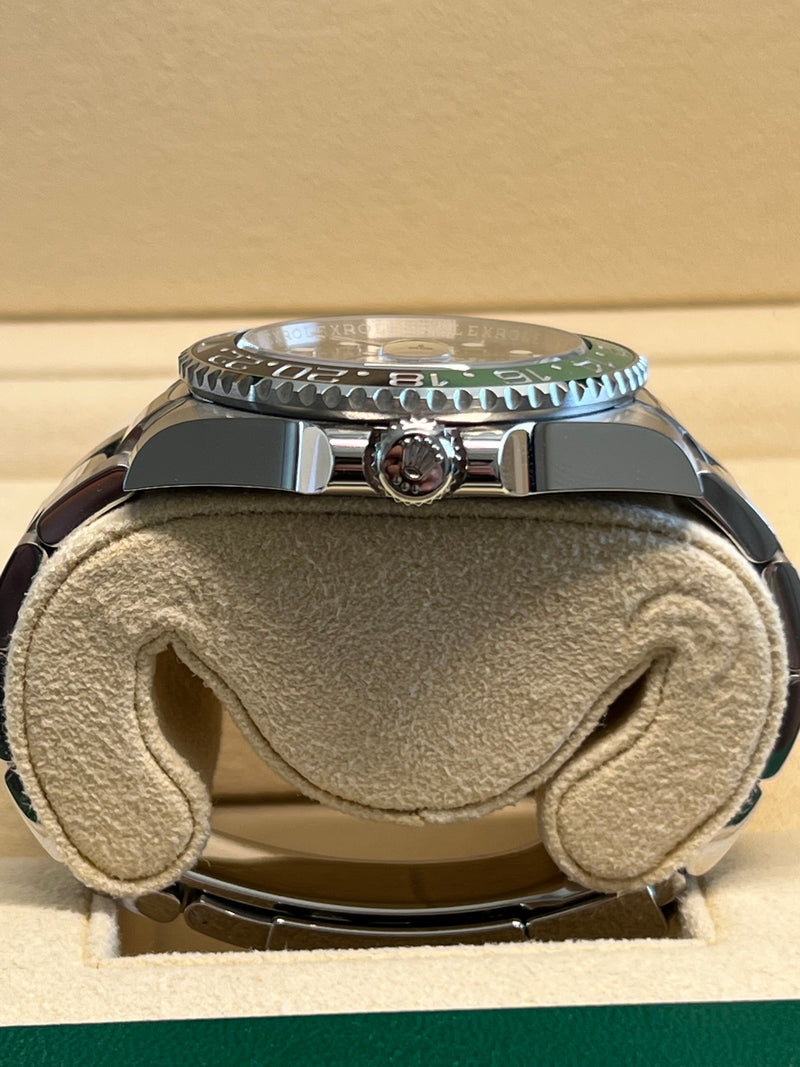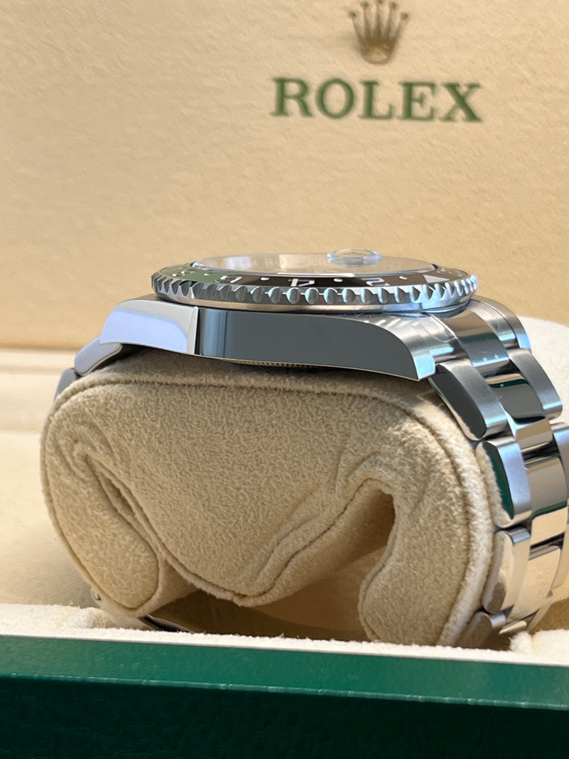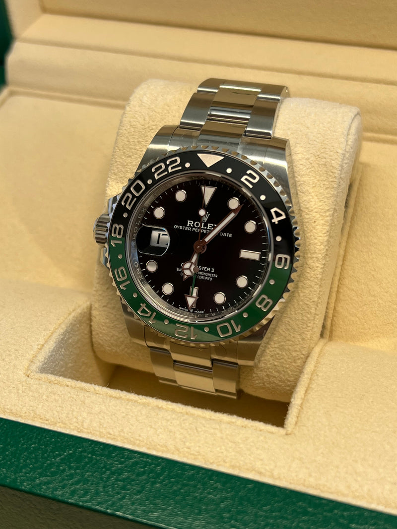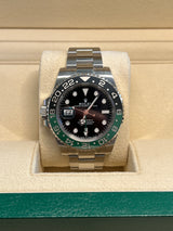 Pre-owned 2023 40mm Stainless Steel 126720VTNR Rolex GMT-Master II "Sprite" Black Dial with a Black & Green Bezel on an Oyster Bracelet.
