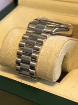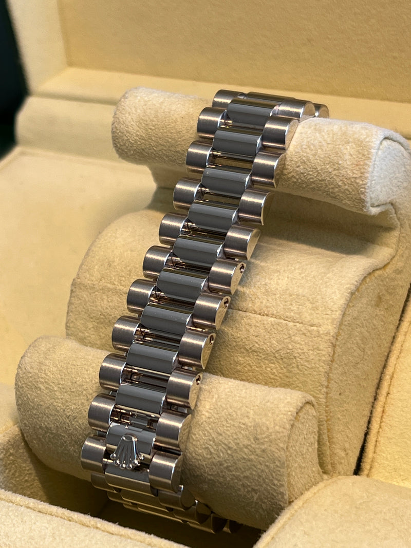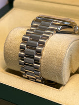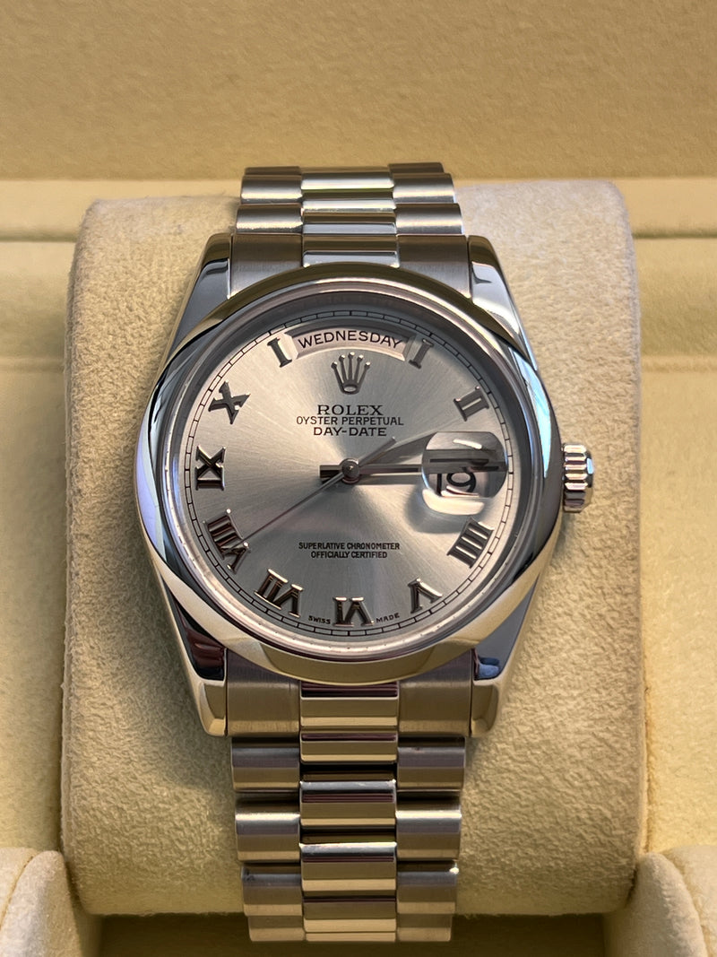 Pre-owned 2001 36mm Platinum 118206 Rolex Ice Blue Roman Numeral Dial Day-Date "Presidential". This watch depicts some signs of wear. This watch includes the original box. The watch also includes a 1 year David and Sons Timepiece warranty.