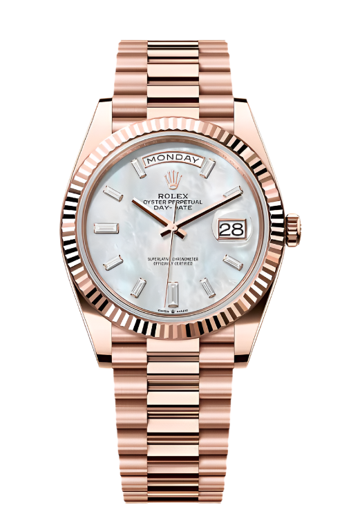 Unworn 2024 40mm Rose Gold 228235 Rolex Day-Date 40 "Presidential" Mother of Pearl (MOP) Baguette Dial with a Fluted Rose Gold Bezel on a Presidential Bracelet.