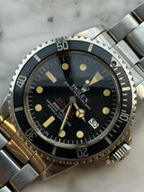 Pre-owned 40mm Stainless Steel 1665 Rolex Sea-Dweller Black Dial Double Red with a Black Ceramic Bezel on an Oyster Bracelet.