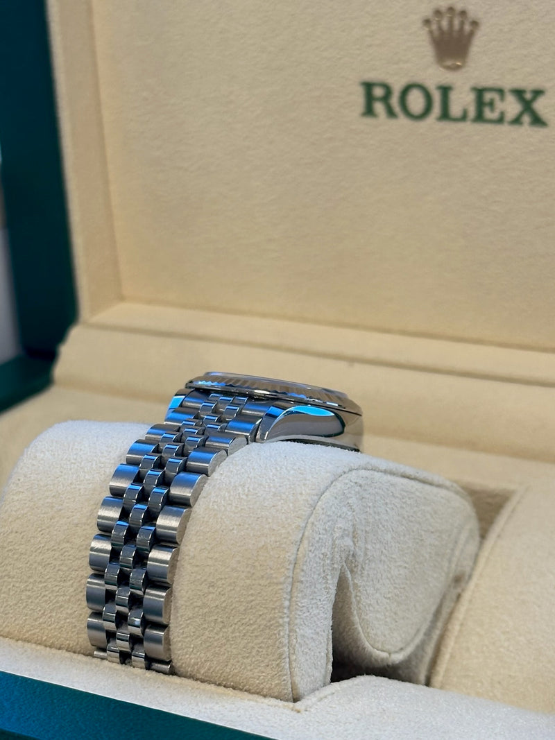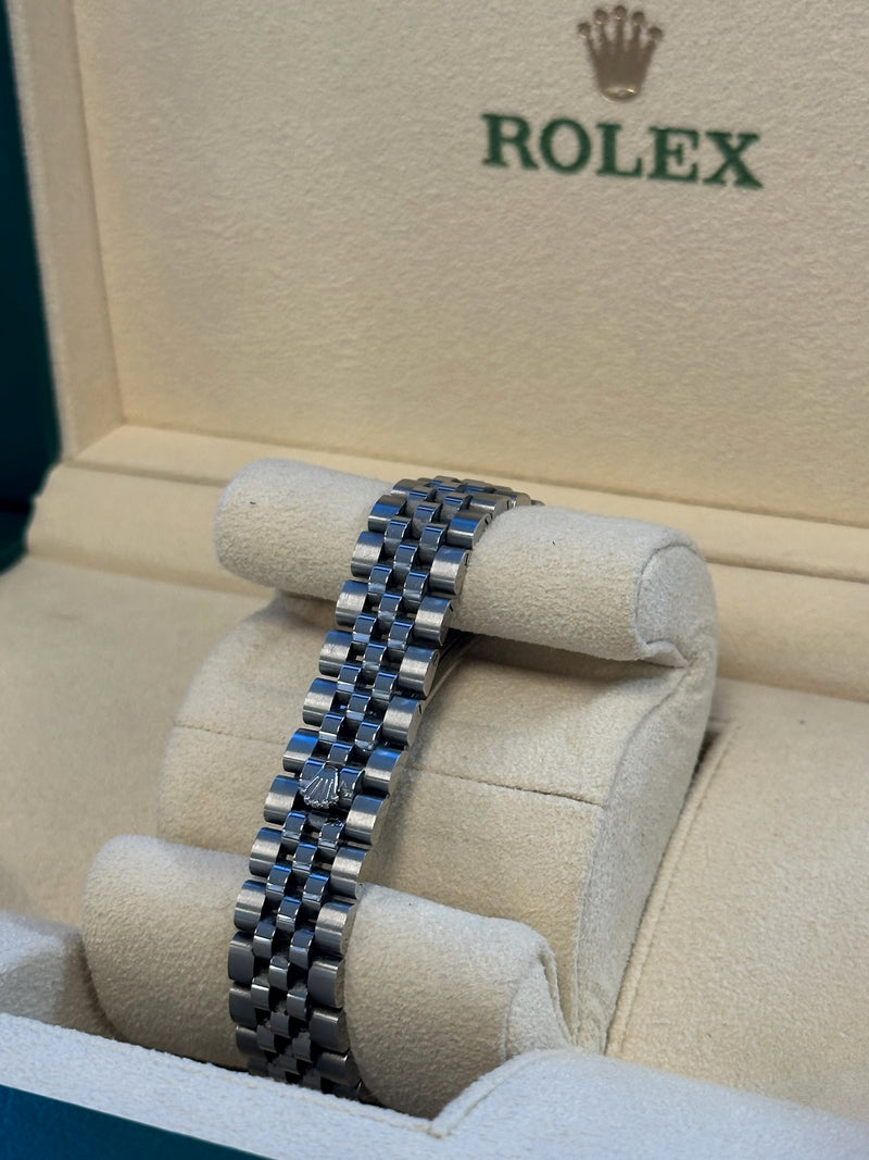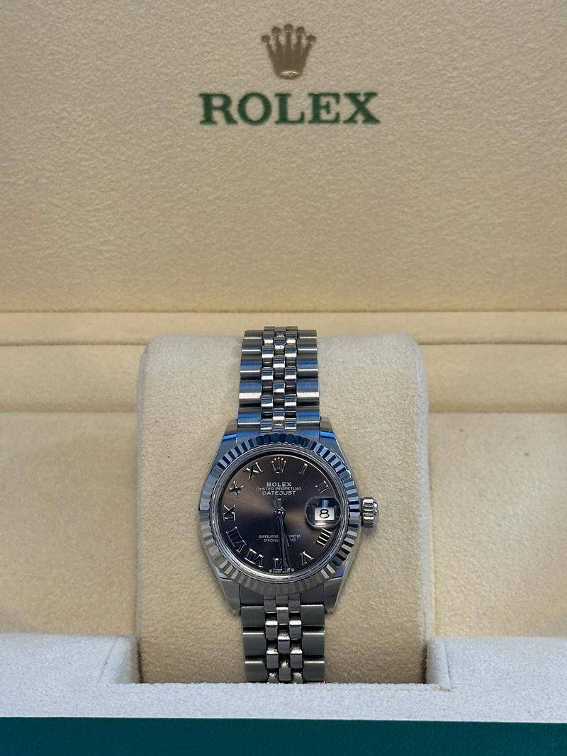 Pre-owned 2024 28mm Stainless Steel 279174 Rolex Lady-Datejust Grey Roman Dial with a White Gold Fluted Bezel.