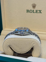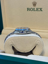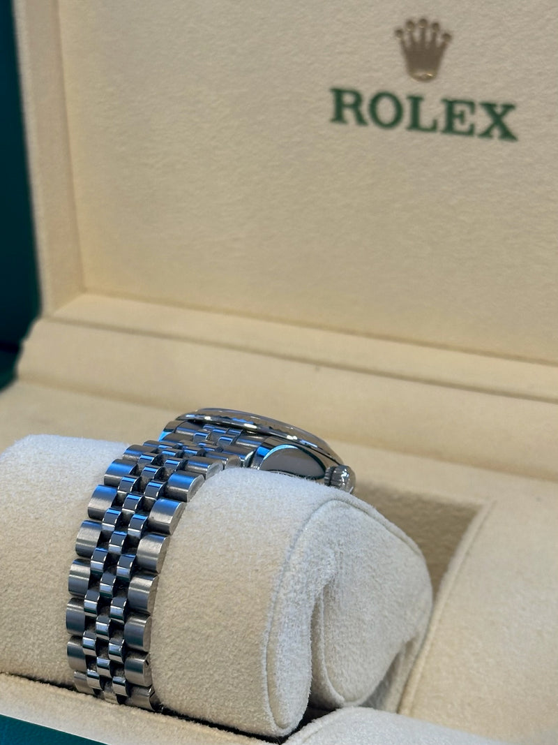 This watch depicts signs of wear. This watch includes the original Rolex warranty card and the original Rolex box. The watch also includes a 1 year David and Sons Timepiece warranty.