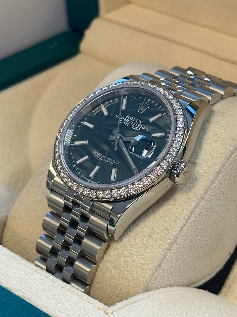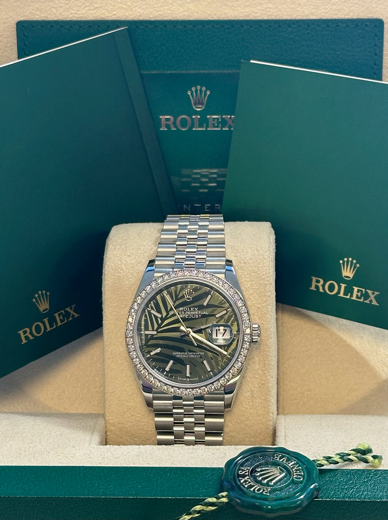 Pre-owned 2024 36mm Stainless Steel 126284RBR Rolex Datejust 36 Green Palm Motif Dial with a Diamond Bezel on a Jubilee Bracelet.