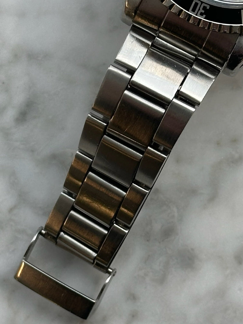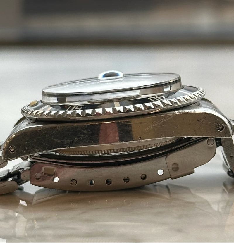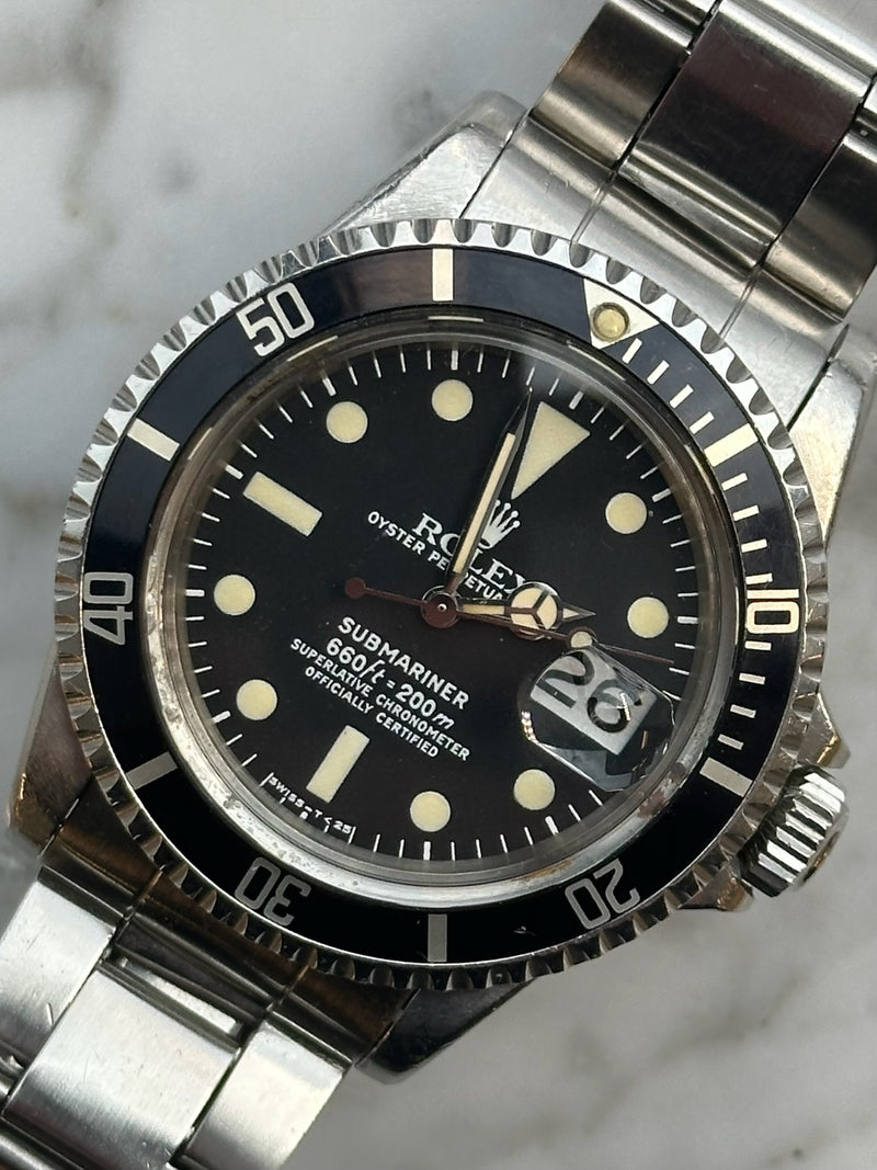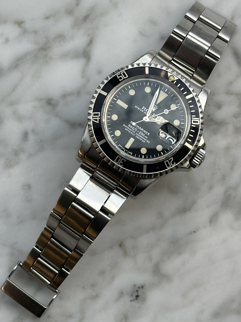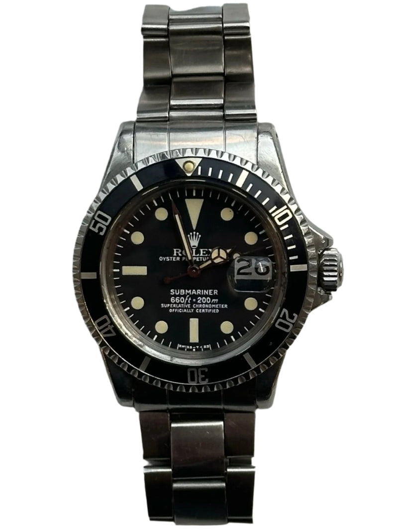 Pre-owned 40mm Stainless Steel 1680 Rolex Submariner Black Dial with a Black Bezel on an Oyster Bracelet.