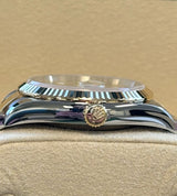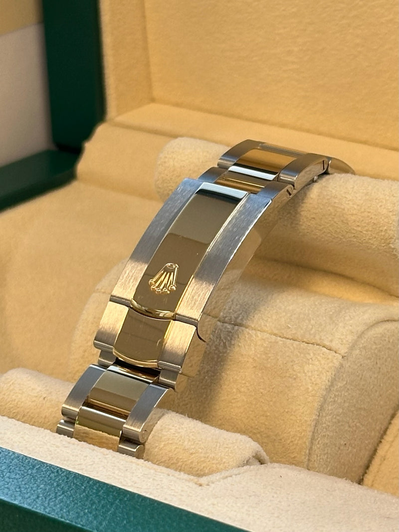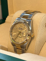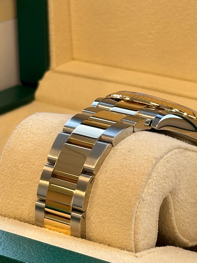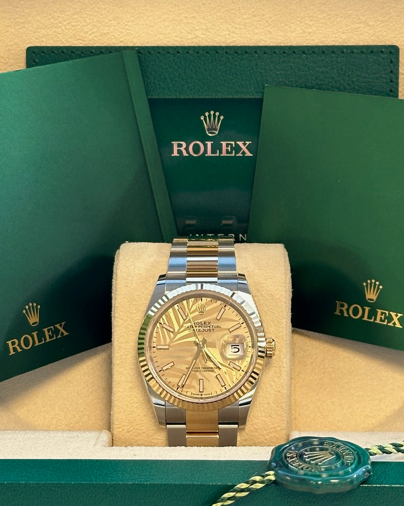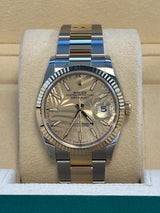Unworn 2024 36mm Two Tone Yellow Gold 126233 Rolex Datejust 36 Palm Champagne Index Dial with a Fluted Yellow Gold Bezel on an Oyster Bracelet.