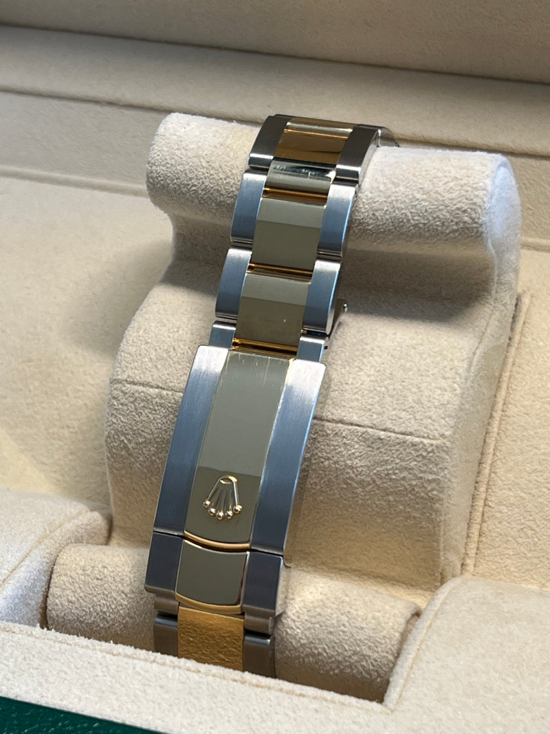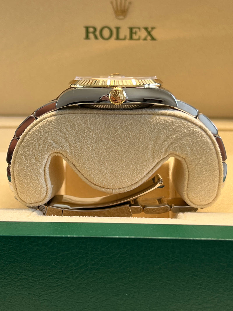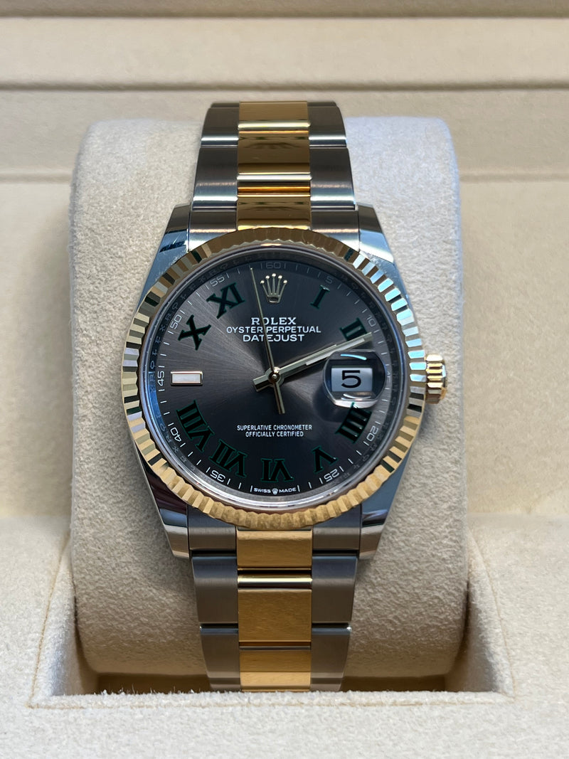 Pre-owned 2024 36mm two tone yellow gold 126233 Rolex Datejust 36 Wimbledon Dial with a Yellow Gold Fluted Bezel and Oyster Bracelet.