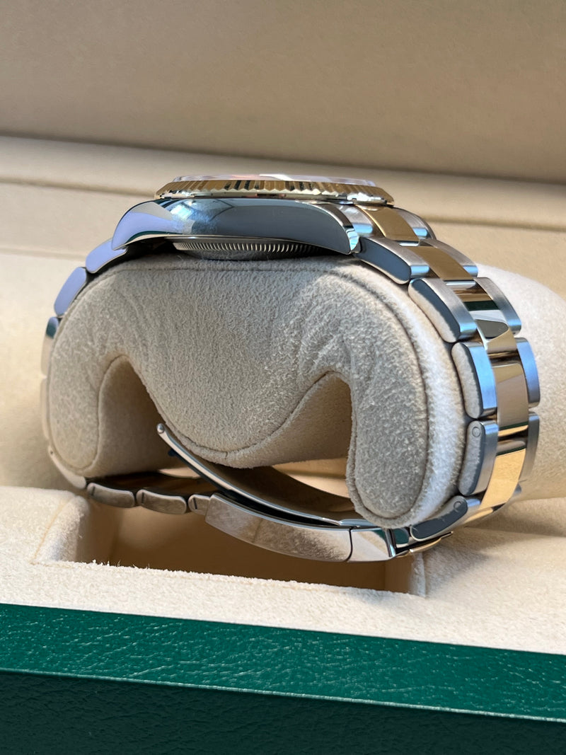This watch depicts some signs of wear. This watch includes the original Rolex warranty card and the original Rolex box. The watch also includes a 1 year David and Sons Timepiece warranty.