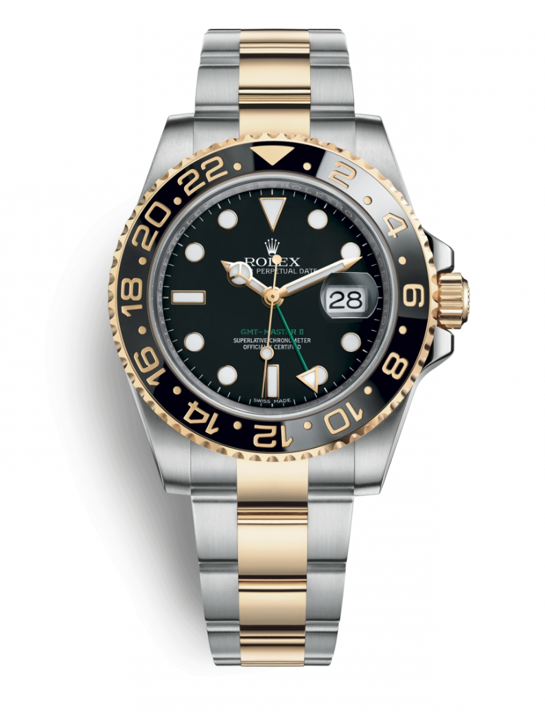 Pre-owned 2009 40mm Yellow Gold 116713LN Rolex GMT-Master II with a Black Dial.