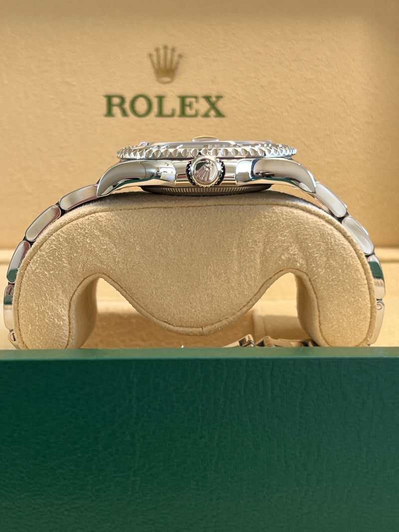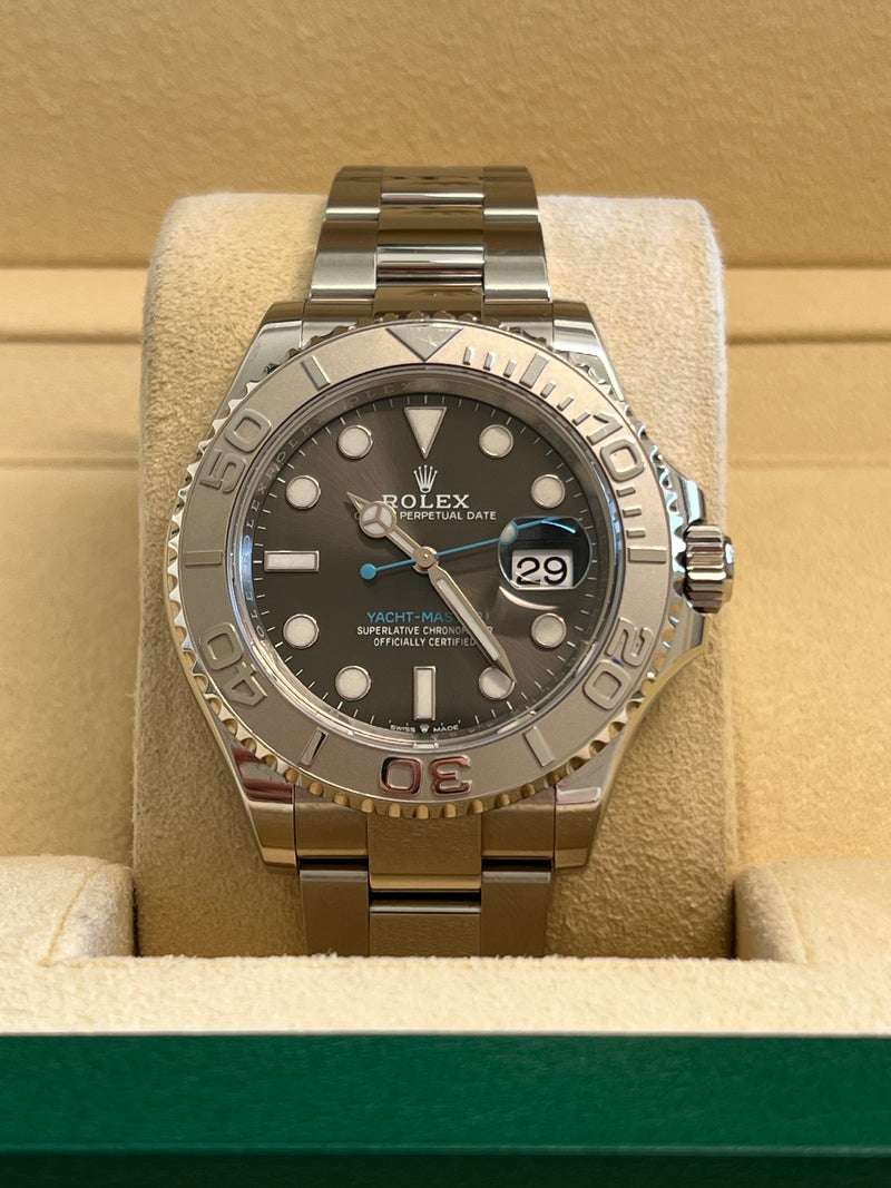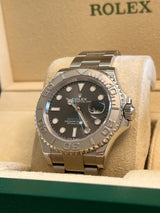 Pre-owned 2023 40mm Stainless Steel 126622 Rolex Yacht-Master Rhodium Dial with a Platinum Bezel on an Oyster Bracelet.